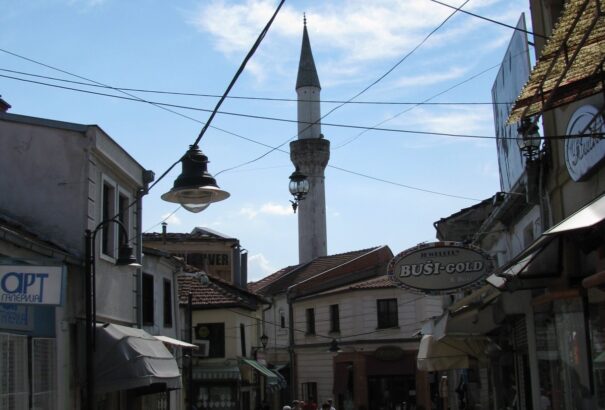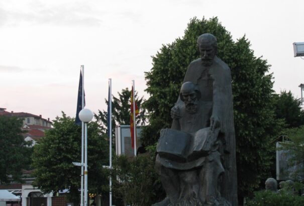 A macedónok pedig milyenek is? Egy másfél milliós kis nép, aki a 90-es évek elején nyerte el a függetlenséget – és mint olyan, kicsit tele van komplexusokkal (ismerős, nem?). Például az idegenvezetőnk fontosnak találta elmondani a mindenféle macedón rekordokat, ami kimerült abban, hogy ez a második legnagyobb a világon, az a harmadik legrégebbi a Balkánon, ez a negyedik ilyen épület a világban … ami kicsit nekem olyan viccesnek hatott, hogy meg inkább ki lett ezzel hangsúlyozva, hogy sehol egy első hely. Rengeteg házra van kifüggesztve a macedón zászló, mintegy nemzeti öntudatra buzdításképpen, vagy mint demonstráció, hogy megmutassák: „mi igenis igazi macedónok, igazi nemzet vagyunk“. A másik ok pedig, hogy az országban nagyon nagy az albán kisebbség száma (a kétmilliós ország 35% albán). Az albánokról pedig tudni kell, hogy muszlim vallásúak. Az ország nyugati felén a kis templomok helyét fokozatosan veszik át a kicsi mecsetek, karcsú minaretekkel, és az apró falvakban szinte zászlóháború tombol – mikor a házak felére albán, a másik felére macedón zászló van kifüggesztve.