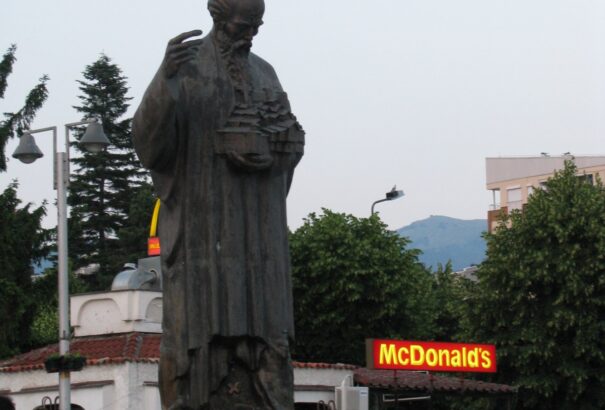 A mecsetek kompenzálása végett a macedónok minden nagyobb hegyre felhúznak egy jópár méteres keresztet, amelyeket éjjel kivilágítanak, hogy megmutassák, azért mégis milyen kultúrkörbe tartozik az ország. Itt viszont tényleg van is ok a büszkeségre, Macedónia területéről származtak az első keresztény szlávok, az ortodox vallás megalapítóinak: Szent Cirillnek és Metódnak, és az ő első követőiknek – Szent Naum, Szent Klement, és Szent Gorazd – rengeteg emlékművük található országszerte, főleg az Ohridi-tó közelében, ahol Naum és Klement elvonultan éltek kis kolostoraikban. Érdekes az, hogy bár tisztelik őket munkásságukért, nem igazán tudják, hogy merre is jártak hittéríteni …így a Nagymorva Birodalom csak homályosan, Szlovákia meg végképp nem szerepel a köztudatban …