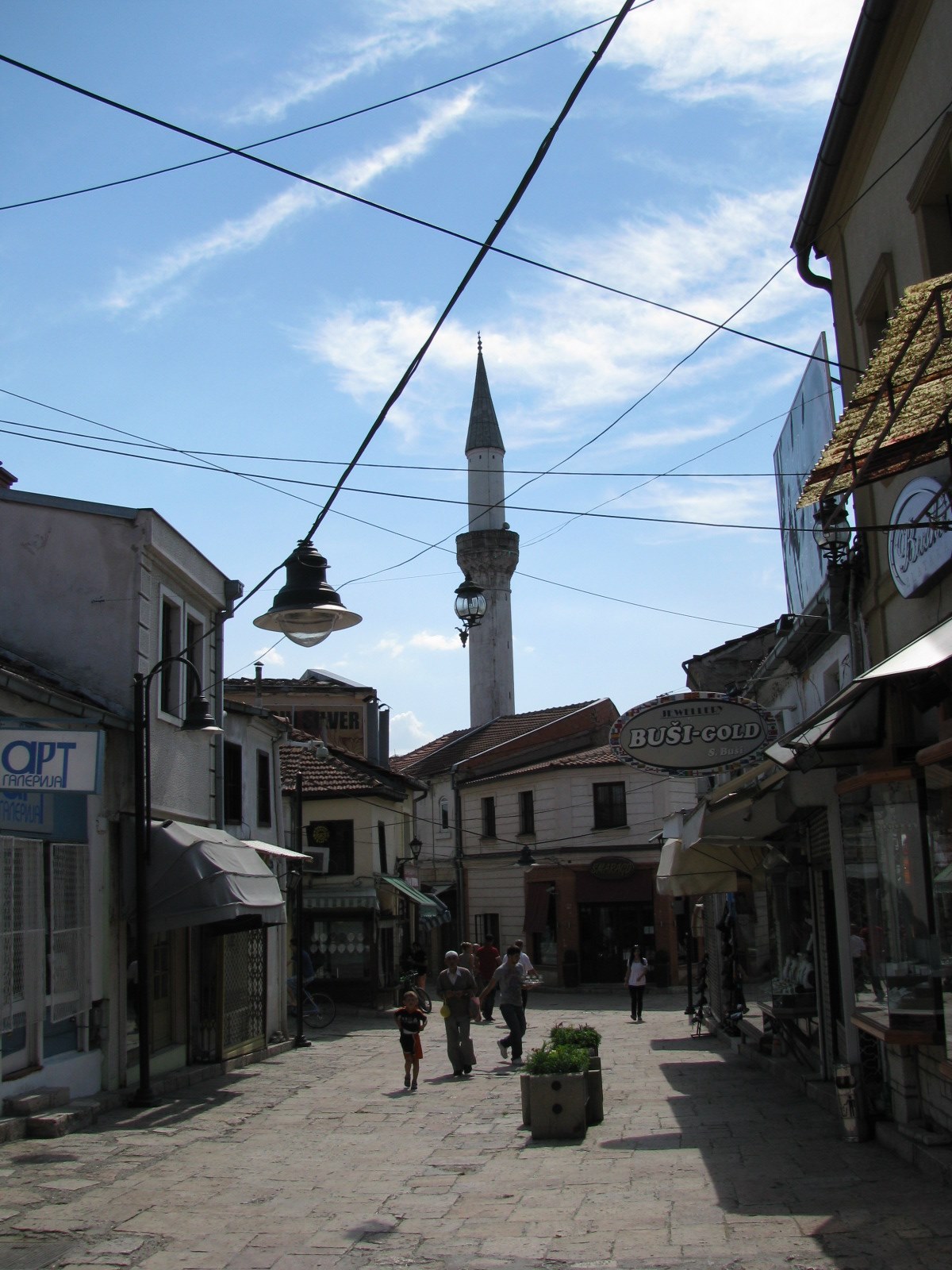 A macedónok pedig milyenek is? Egy másfél milliós kis nép, aki a 90-es évek elején nyerte el a függetlenséget – és mint olyan, kicsit tele van komplexusokkal (ismerős, nem?). Például az idegenvezetőnk fontosnak találta elmondani a mindenféle macedón rekordokat, ami kimerült abban, hogy ez a második legnagyobb a világon, az a harmadik legrégebbi a Balkánon, ez a negyedik ilyen épület a világban … ami kicsit nekem olyan viccesnek hatott, hogy meg inkább ki lett ezzel hangsúlyozva, hogy sehol egy első hely. Rengeteg házra van kifüggesztve a macedón zászló, mintegy nemzeti öntudatra buzdításképpen, vagy mint demonstráció, hogy megmutassák: „mi igenis igazi macedónok, igazi nemzet vagyunk“. A másik ok pedig, hogy az országban nagyon nagy az albán kisebbség száma (a kétmilliós ország 35% albán). Az albánokról pedig tudni kell, hogy muszlim vallásúak. Az ország nyugati felén a kis templomok helyét fokozatosan veszik át a kicsi mecsetek, karcsú minaretekkel, és az apró falvakban szinte zászlóháború tombol – mikor a házak felére albán, a másik felére macedón zászló van kifüggesztve.