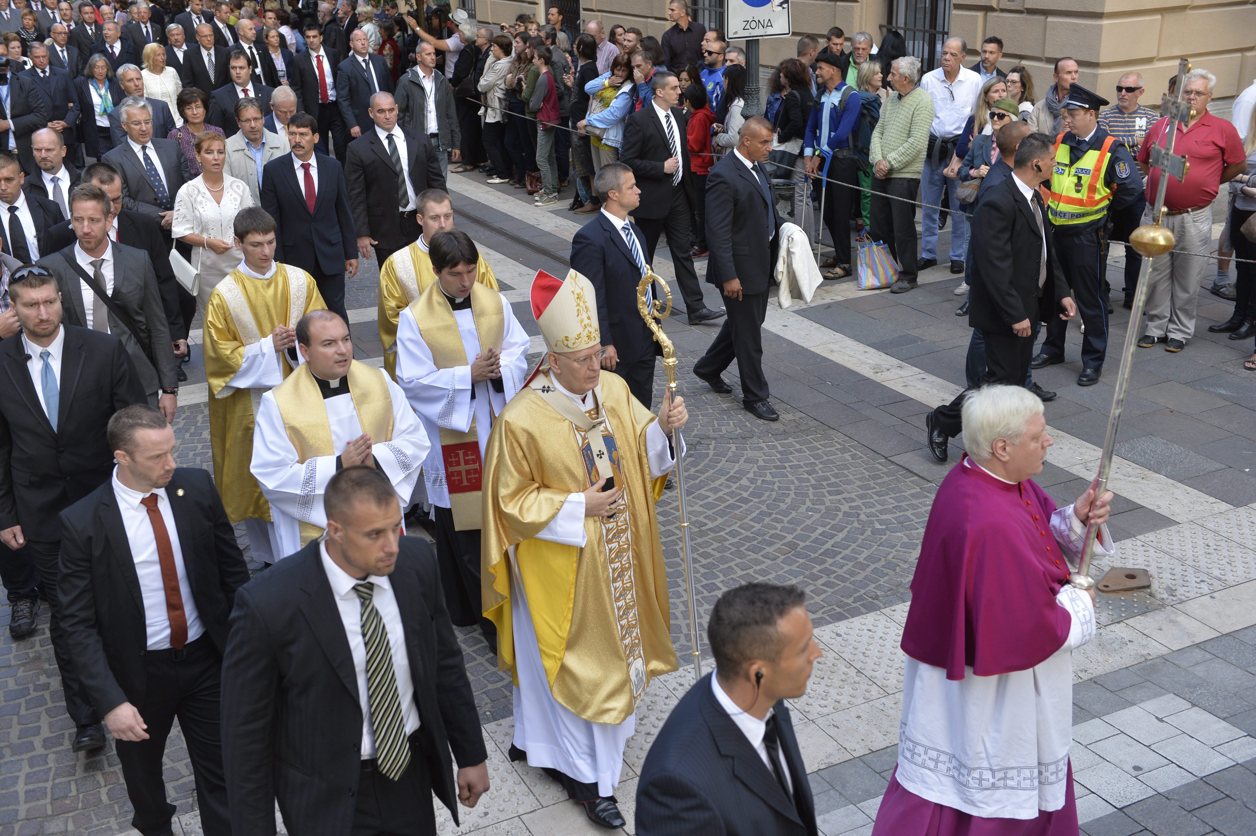 Erdõ Péter bíboros, esztergom-budapesti érsek (k) a Szent Jobb-körmenetben az ünnepi szentmise után a fõvárosi Szent István-bazilika elõtti Zrínyi utcában 2015. augusztus 20-án. A háttérben Áder János köztársasági elnök (negyedik sor j2) és felesége, Herczegh Anita (negyedik sor j3), mögötte Semjén Zsolt nemzetpolitikáért felelõs miniszterelnök-helyettes (b2).