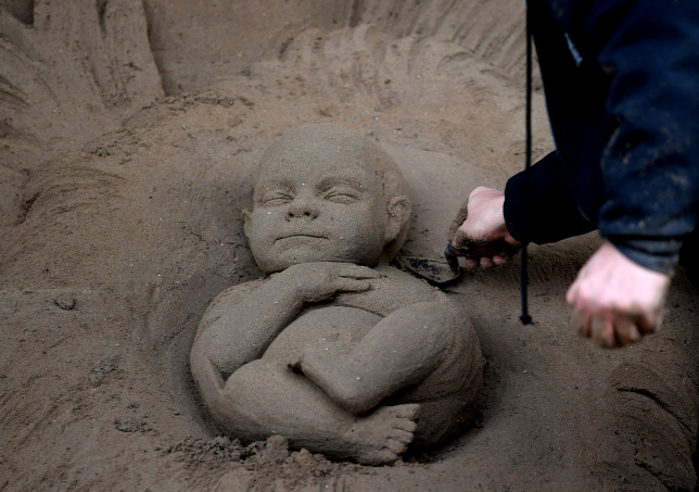 A több száz tonnányi homokot hatalmas piramis alakúra tömörítették és a csúcsától kezdve kezdték el készíteni a betlehemet. A szobrászok botokkal, vakolókanalakkal és fogorvosi eszközökkel is dolgoztak a kényesebb helyeken.