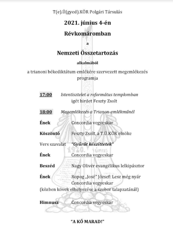 A T(e).Ü(gyed).KÖR Polgári Társulás “A KŐ MARAD!” 2021. június 4-én Révkomáromban, a Nemzeti Összetartozás alkalmából a trianoni békediktátum emlékére megemlékezést szervez.