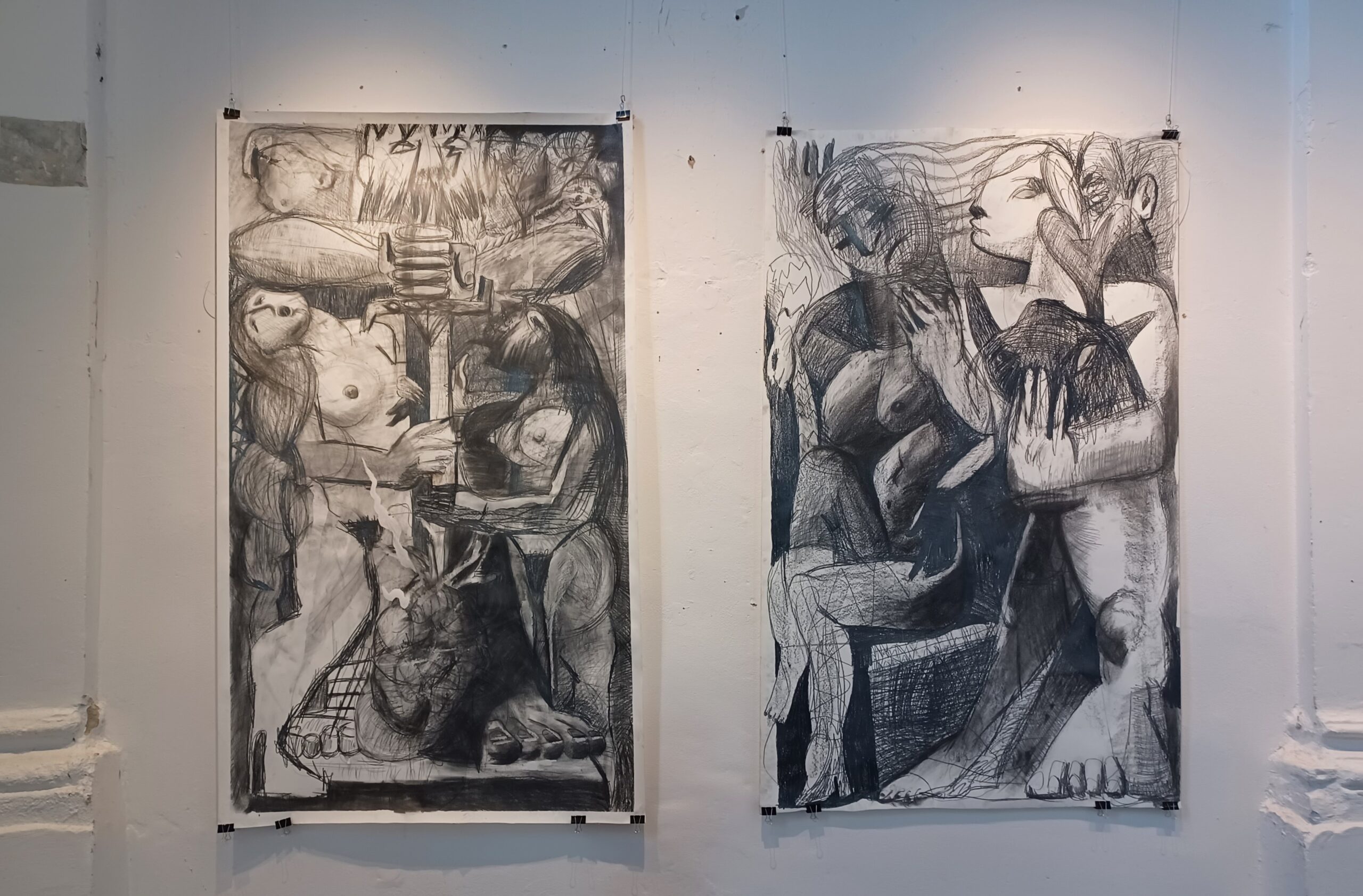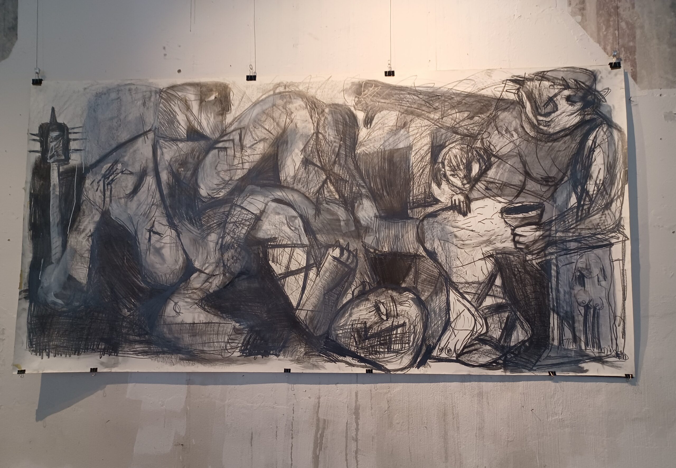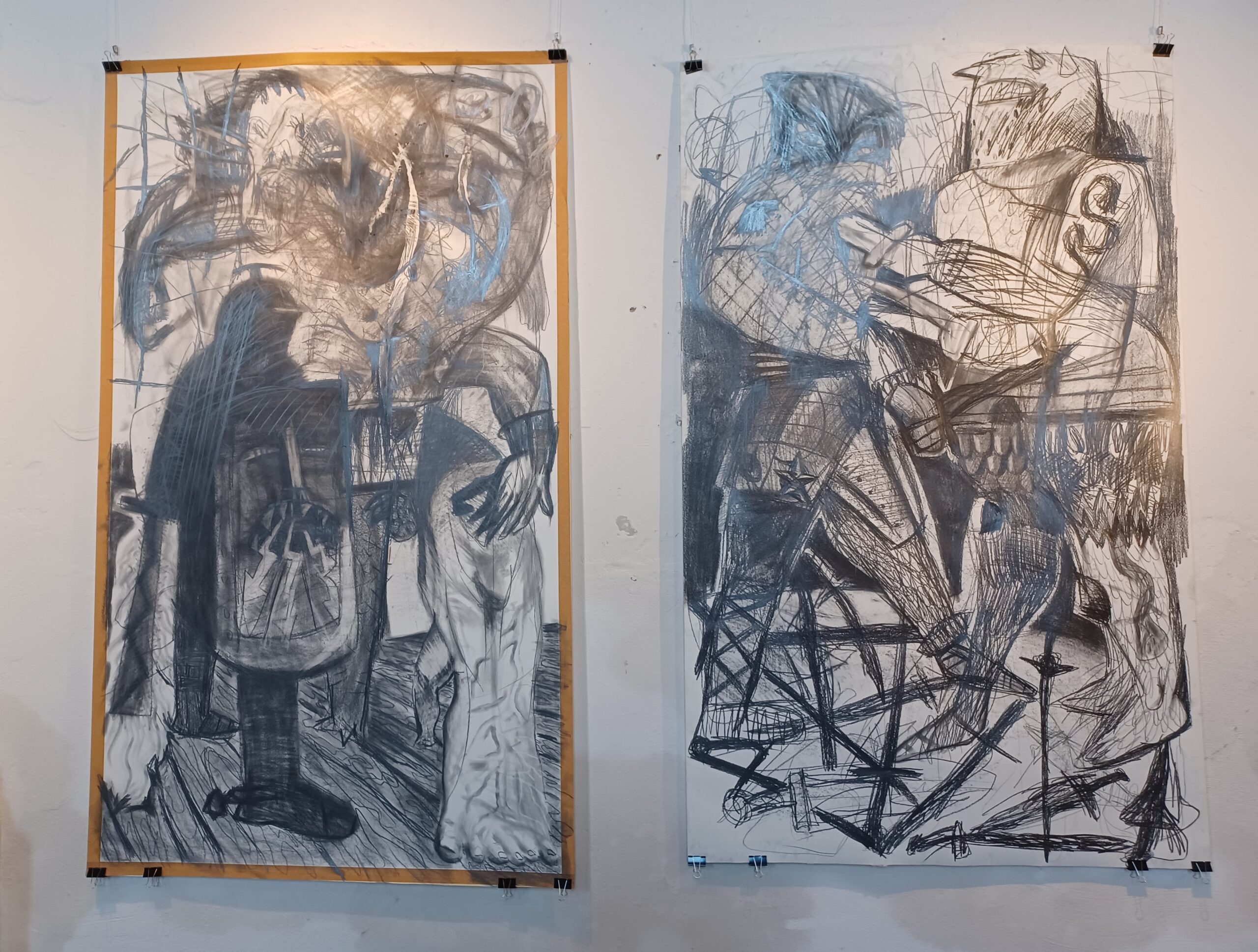 „A kiállítás címe nemcsak a kész munkákra és azok létrejöttére utaló beszédes címadás, hanem utal a rajzok témáira is, ugyanis a Rajzszíntér a harcszíntérre asszociál, mert jellemzően ókori, döntően görög mitológiából vett toposzokat, csatákat jelenítenek meg és írnak át gigantikus méretű rajzmezőiken. Ugyanis mindketten élénk érdeklődéssel fordulnak a mitológiai történetek felé, amelyek rajzi megvalósulásai számos korunkbeli áthallásban bővelkednek. … az ókori mitológiából kölcsönzött témákat mi, a 21. század szemlélői nem súlyos történetekként, hanem könnyed, humoros epizódokként is értelmezhetjük és átélhetjük, a rajzok által közvetítve. Árad belőlük a játékosság…miközben az is egyértelmű, hogy nagyon is komolyan veszik mind a választott témák szabadon értelmezett újraírását, mind az alkalmazott technikával a maguk elé tűzött cél és feladat megoldását.”