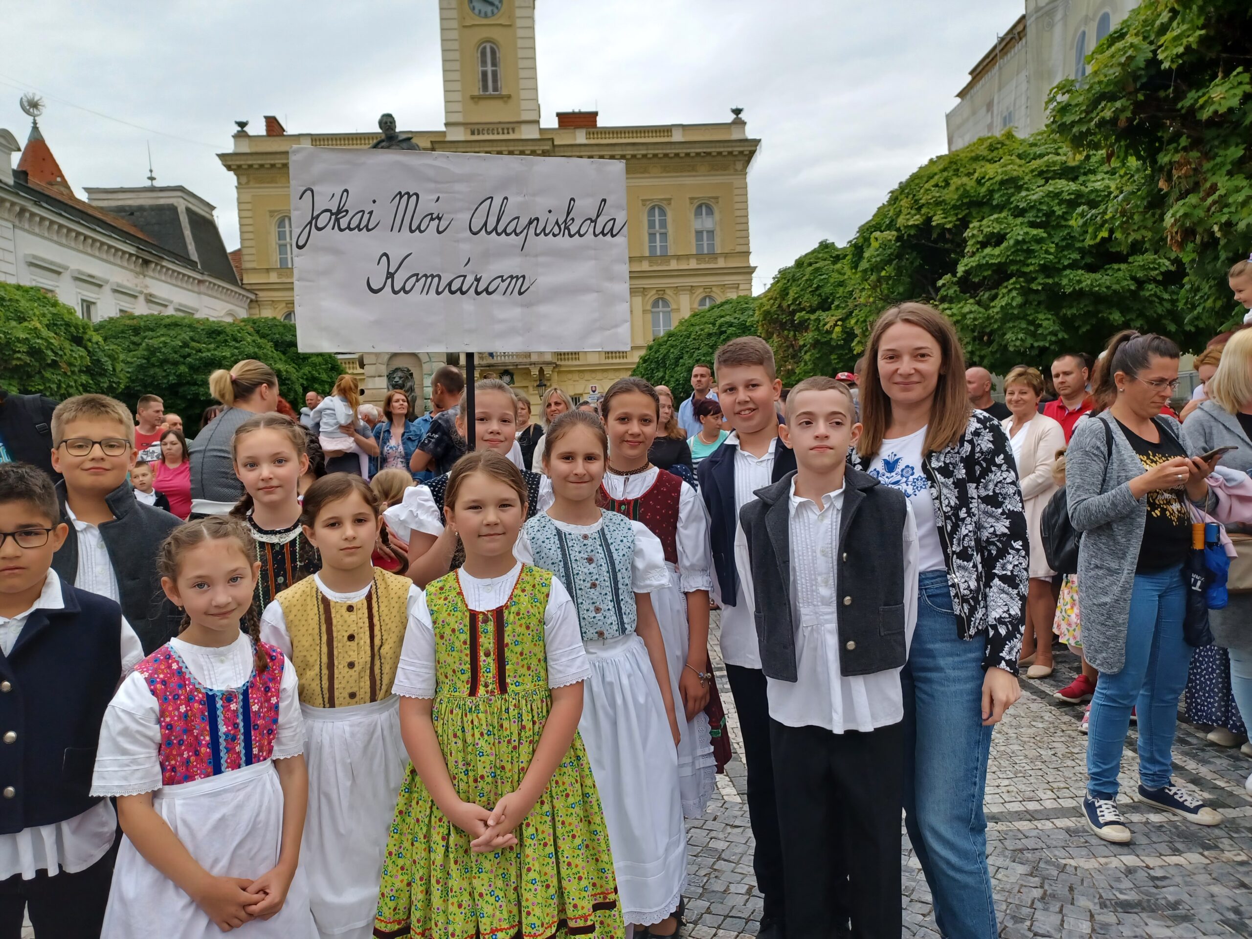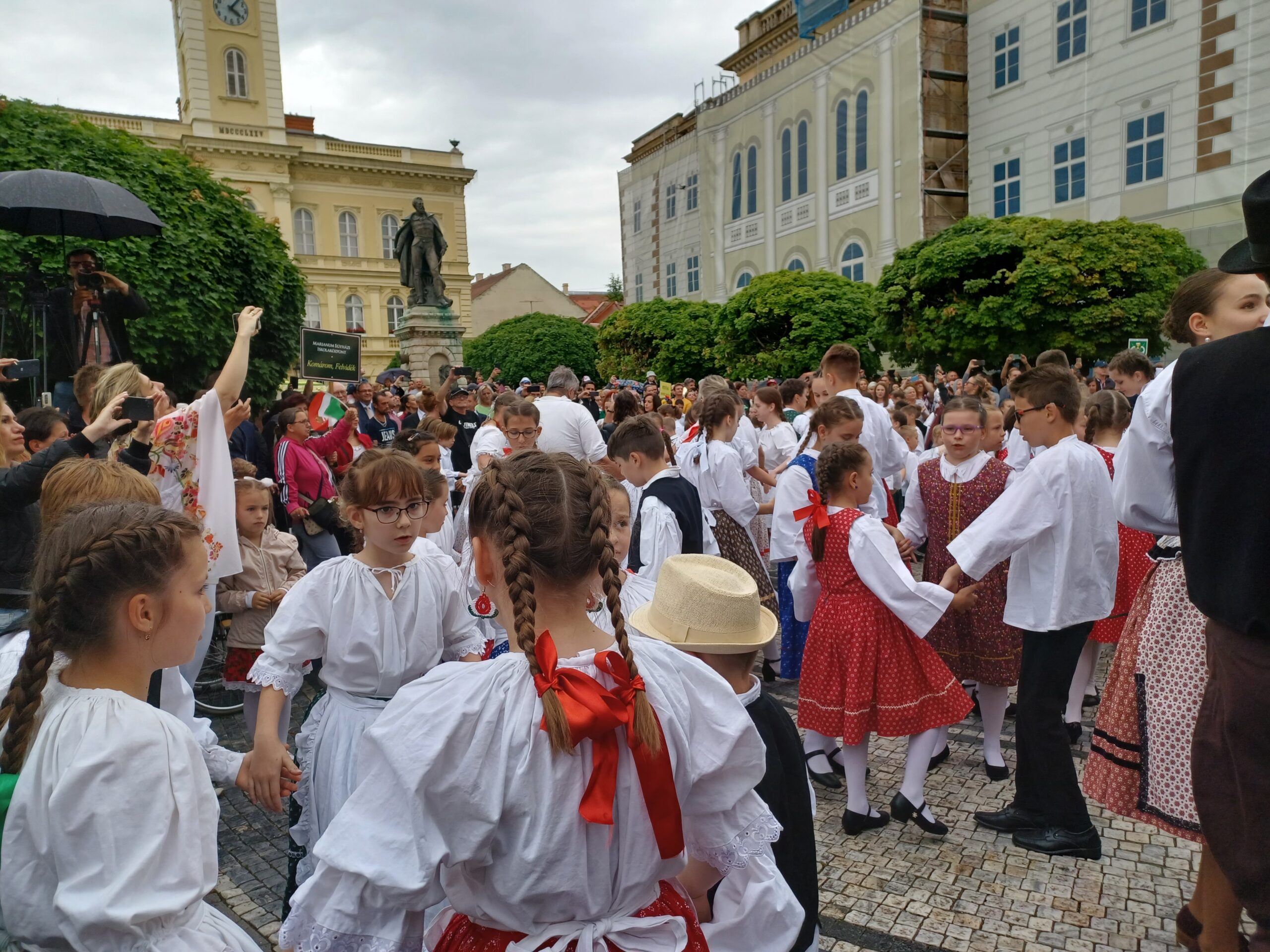 Forró Krisztián köszöntője elején Komáromot méltatta, mint a vizek és az erődök városát, majd a következő gondolatsorral fordult a főteret betöltő tarka, népviseletes gyereksereghez: