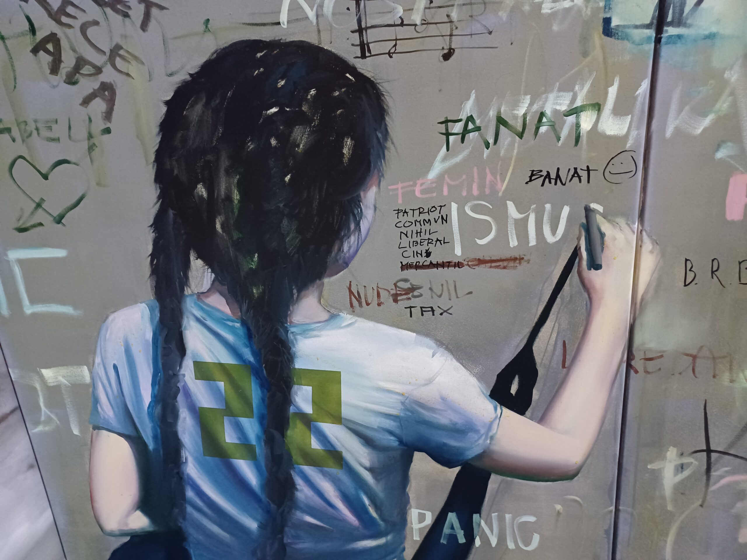 Beszédes, amint egy kislány éppen a falra vetíti ki korunk érzelemvilágát, minden -izmusával együtt, ami nagyon is jellemző életképet mutat. Egymást követi a patriotizmus, a kommunizmus, a fanatizmus, a nihilizmus, a liberalizmus, a cinizmus.