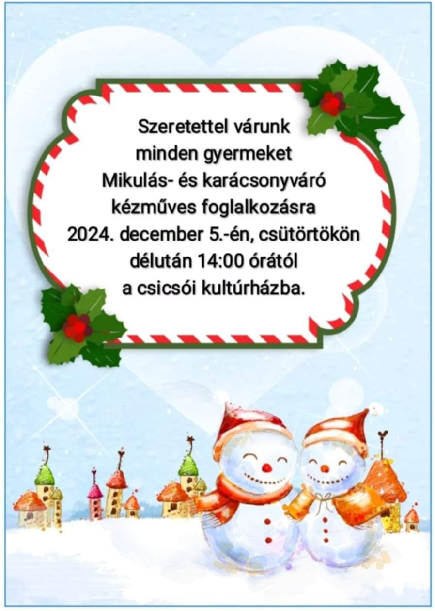 Délután 14:00 órától nyitja meg kapuit az Adventi Kézműves Vásár, ahol főként csicsói és csicsói kötődésű kézművesek árulják majd szebbnél szebb portékáikat. Fellépnek a helyi óvoda növendékei, az alapiskola napközisei, valamint a Czafrangó Sylvia Magán Művészeti Alapiskola helyi csoportja.