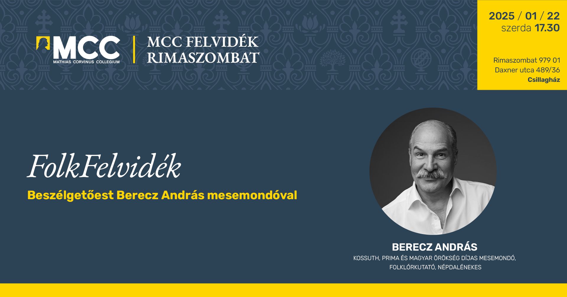 Az MCC Felvidék idei első rimaszombati vendége a kortárs népi kultúra egyik legismertebb képviselője, Berecz András. A Kossuth, Prima és Magyar Örökség díjas mesemondó, folklórkutató, népdalénekes a FolkFelvidék rendezvénysorozat keretében látogat el Rimaszombatba. A rendezvény ezúttal is ingyenes, de regisztrációhoz kötött, amelyhez a linket itt találja: