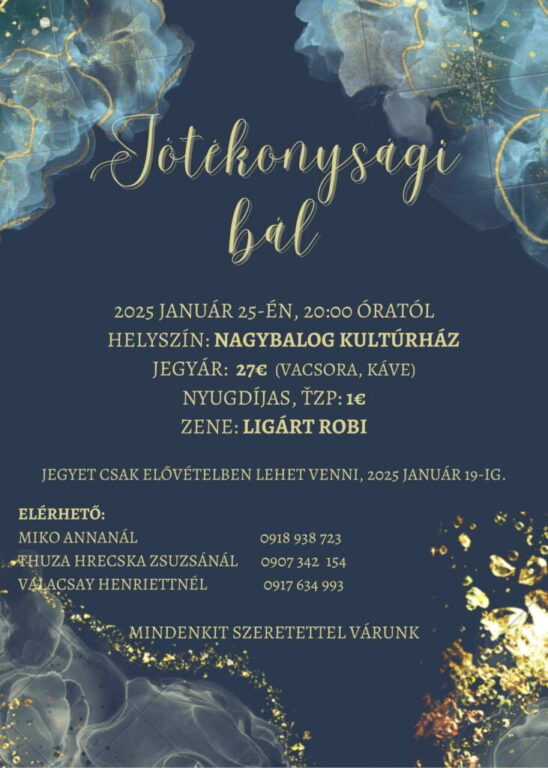 Január 25-én, szombaton 20:00 órakor Nagybalogon, a kultúrházban jótékonysági bál lesz.