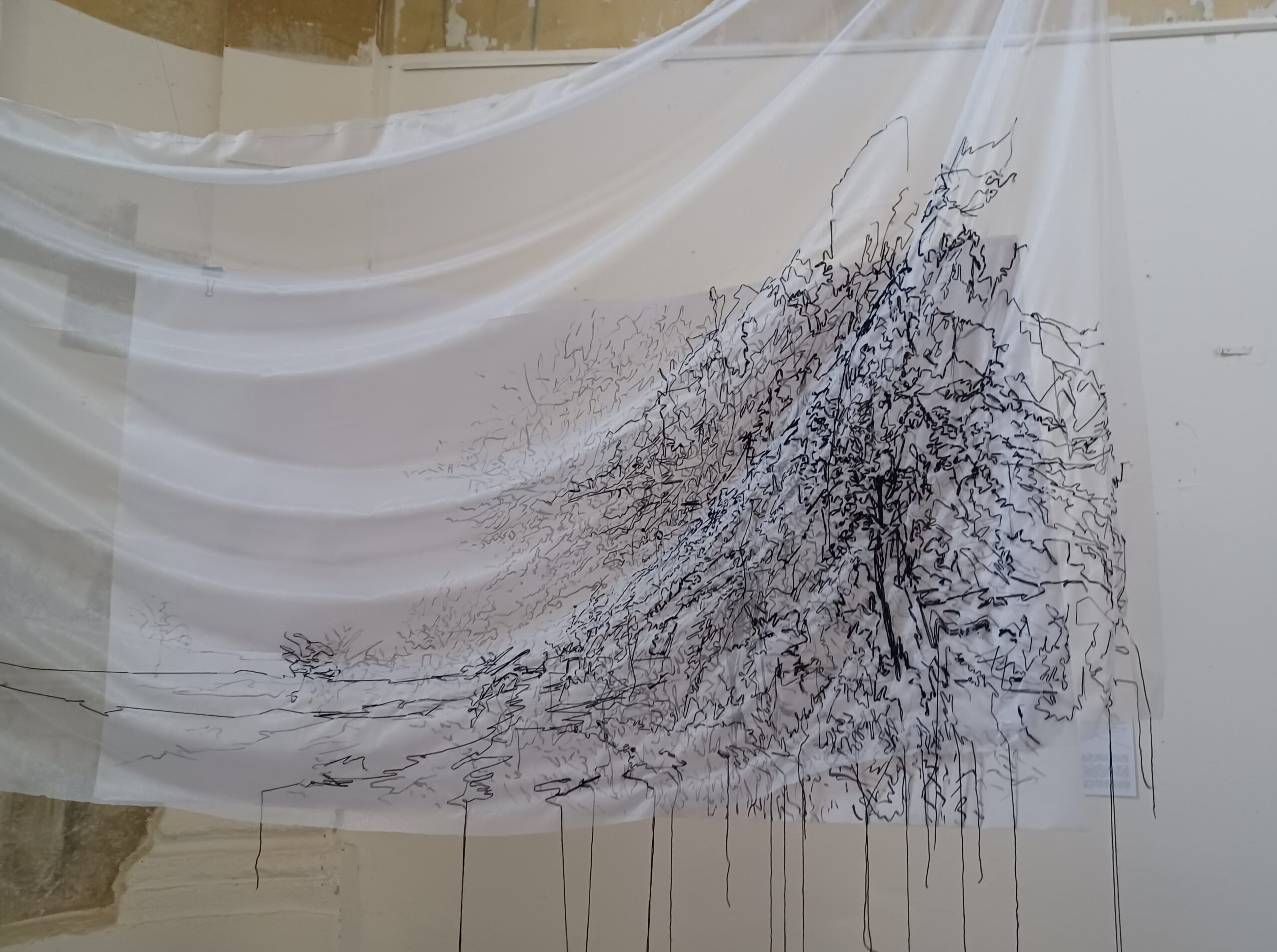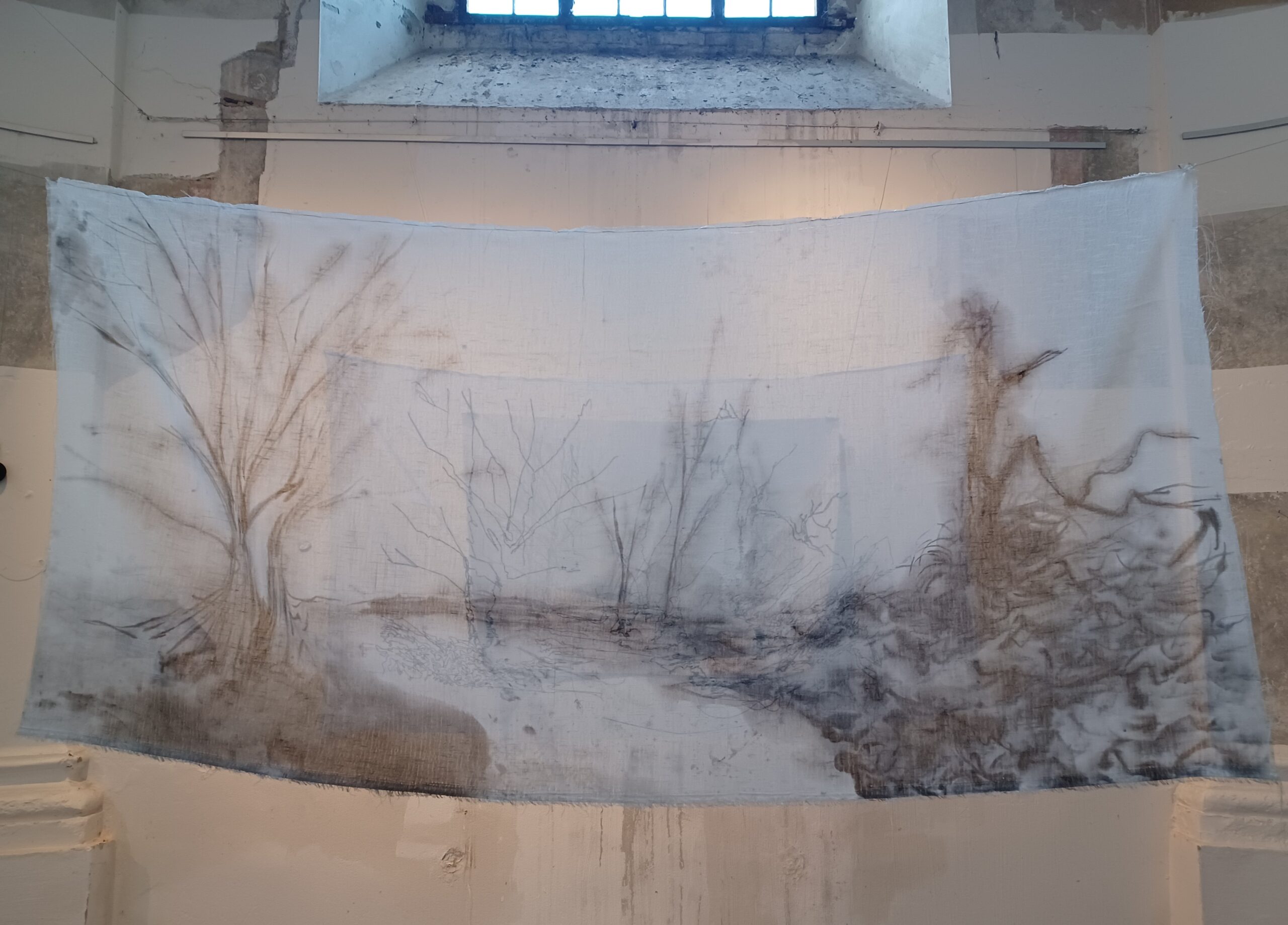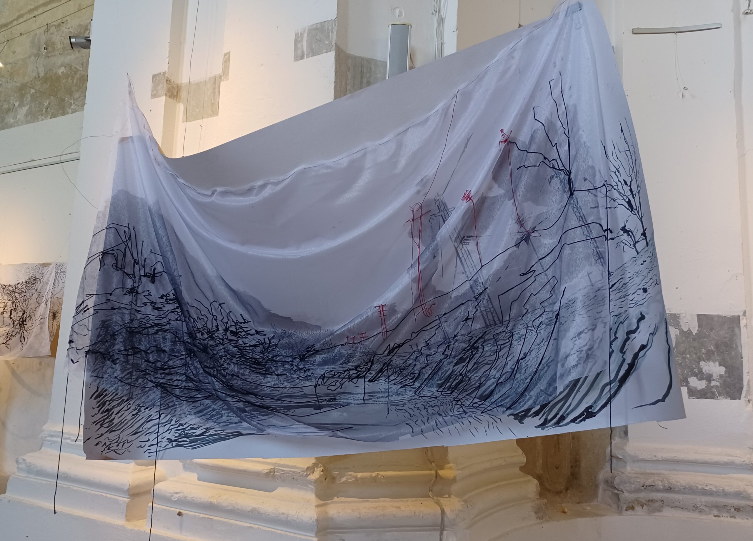 Mazán Anikó három réteggel dolgozik. Az időt, az emlékezést és a megtett útszakasz látványát rajzolja egybe, szövi, festi a textíliára.