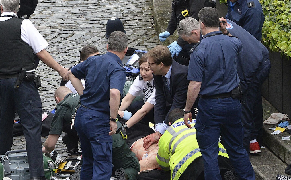 A brit sajtó közben hősként ünnepli Tobias Ellwood parlamenti képviselőt, helyettes külügyminisztert, aki megpróbálta megmenteni a leszúrt rendőrt. A képen az látszik, hogy Ellwood szívmasszázzsal próbálja újraéleszteni a súlyos sérültet.