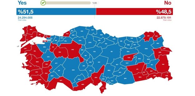 Isztambulban a nemek 50,9 százalékkal, Ankarában pedig 50,1 százalékkal vezetnek. Izmirben is a nemek tábora van többségben 68,5 százalékkal a részeredmények szerint, csakúgy mint Antalyában és Adanában, valamint a többségében kurdok lakta délkeleti Diyarbakirban, ahol szintén többen szavaztak az elnöki rendszer bevezetése ellen. Bursában 53,2 százalékkal az igenek vezetnek.