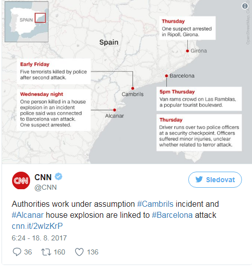 A katalán rendőrség agyonlőtt öt feltételezett terroristát egy éjszakai akcióban. A tájékoztatás szerint az illetők szintén gázolásos merényletet követtek el a Barcelonától 120 kilométerre délre fekvő Cambrils tengerparti üdülőhely központjában, és hét embert megsebesítettek, kettőt közülük súlyosan. A rendőrség a nyomukba eredt, rajtuk ütött, és lelőtte őket. Négy feltételezett terrorista a helyszínén életét vesztette, az ötödik később halt bele a sérüléseibe. A helyi média szerint a cambrilsi gázolók nekihajtottak egy rendőrautónak is, amellett, hogy járókelőket gázoltak el.