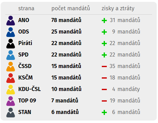 A cseh választások során sokak nagy meglepetésére rendkívül jó eredményt ért el a szélsőjobbnak nevezett SPD (10,64), amely sorrendben csak negyedikként került a cseh képviselőházba, de a második, harmadik és negyedik eredmény között elhanyagolható a különbség – néhány tized százalékpont. A párt élén az a Tomio Okamura áll, aki cseh-japán vegyesházasságból született, és 6 éves kora óta él Csehországban.