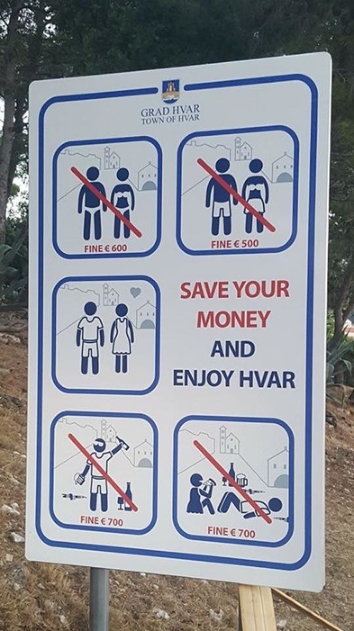 A turistákat többek között arra is felszólítja, hogy ne járjanak a városban fürdőruhában vagy ruhátlanul, ellenkező esetben ugyanis megbírságolhatják őket. A rendelkezések megszegése miatt 500 kunás (67 euró), míg a szabálysértési eljárások során 1000 kunás (134 euró) büntetést kaphatnak.
