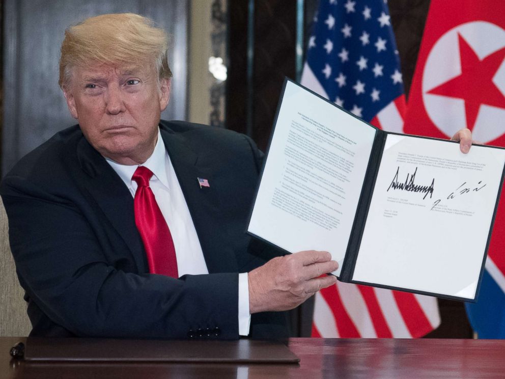 A történelmi jelentőségű szingapúri csúcstalálkozó után Trump és Kim közös dokumentumot írt alá. Az egyelőre ismeretlen tartalmú dokumentumot Trump „meglehetősen átfogónak” nevezte, de mást nem mondott róla. Az észak-koreai vezető a maga részéről az aláíráskor azt mondta, „a világ jelentős változást fog tapasztalni”, ő és Trump úgy döntött, hogy „maguk mögött hagyják a múltat”.