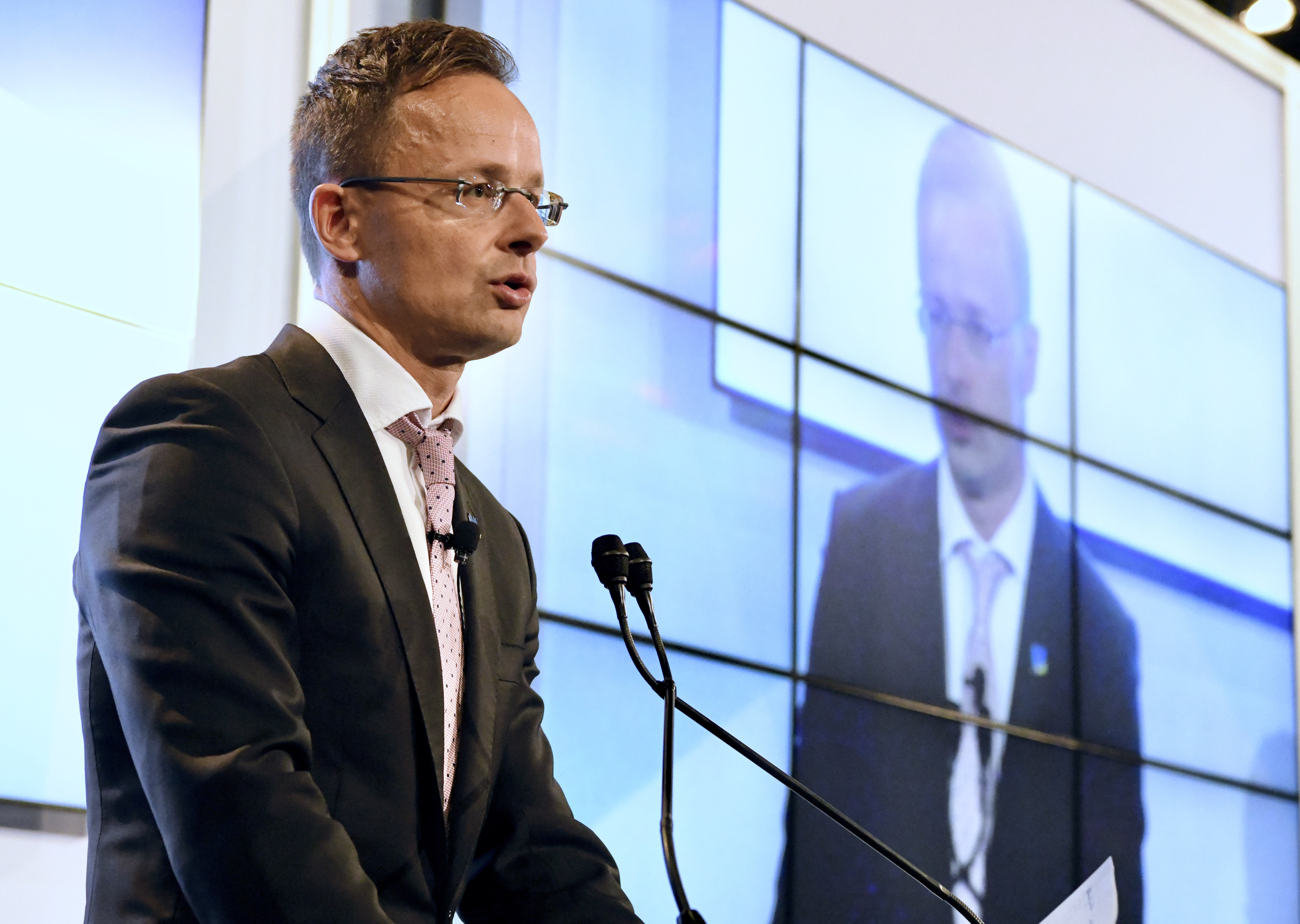 A Külgazdasági és Külügyminisztérium (KKM) által közreadott képen Szijjártó Péter külgazdasági és külügyminiszter felszólal az ukrajnai reformfolyamatokról tartott torontói konferencia panelbeszélgetésén 2019. július 2-án.