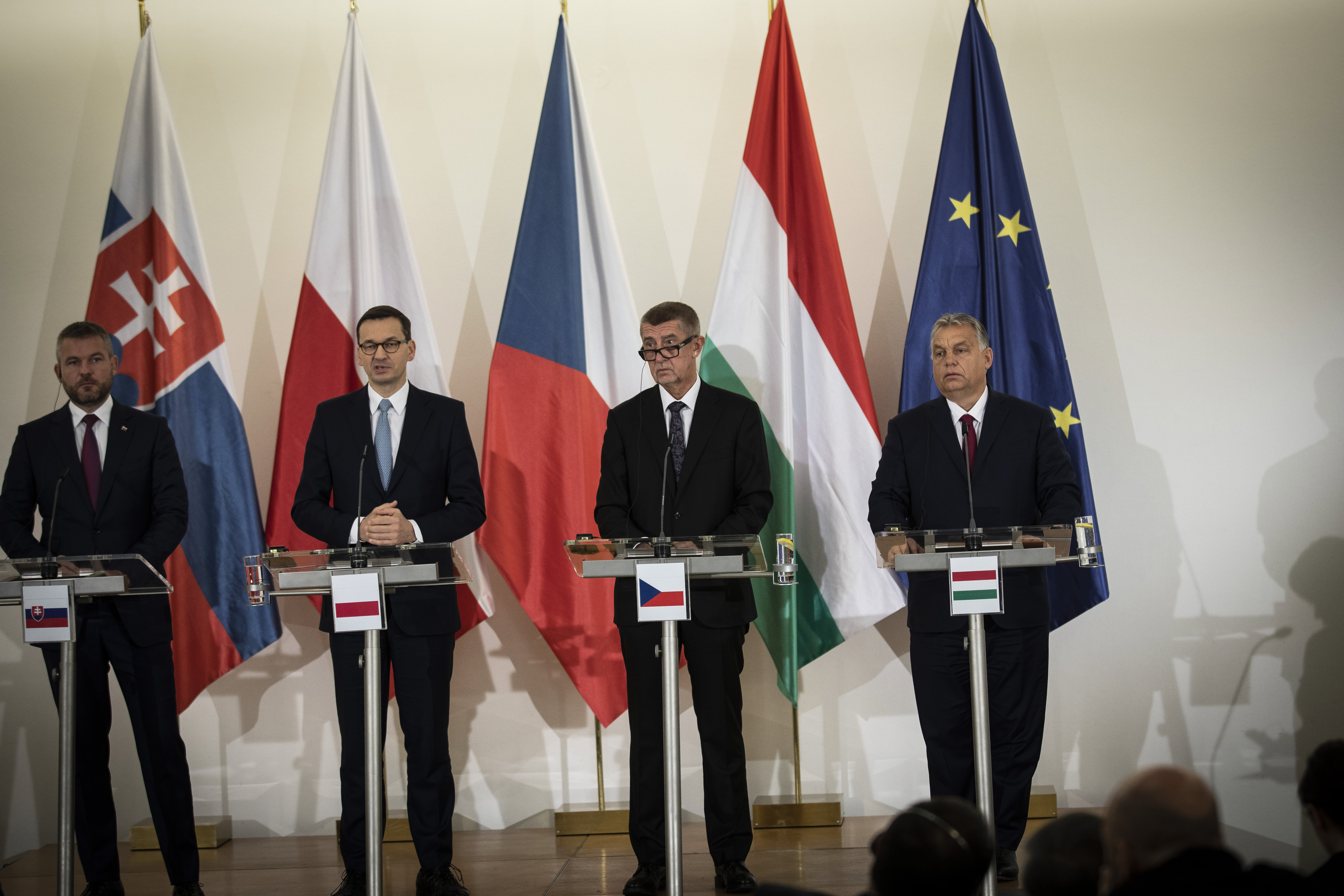 A Miniszterelnöki Sajtóiroda által közreadott képen Orbán Viktor miniszterelnök, valamint Andrej Babis cseh, Mateusz Morawiecki lengyel és Peter Pellegrini szlovák kormányfõ (j-b) a Kohézió Barátai csoport kormányfõi találkozóját megelõzõ V4-es egyeztetés után tartott sajtótájékoztatón Prágában 2019. november 5-én.