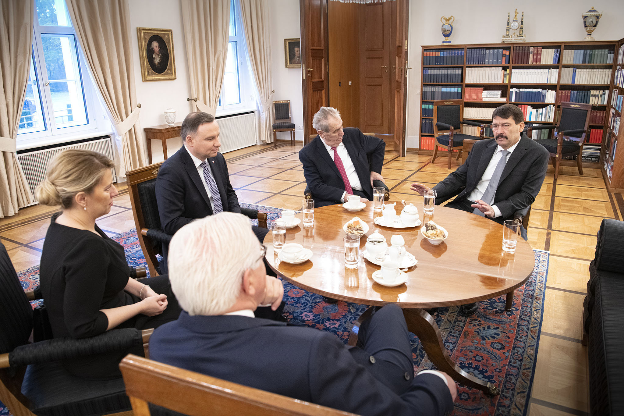 A német szövetségi kormány által közreadott képen Frank-Walter Steinmeier szövetségi elnök (háttal) fogadja Áder János magyar (j), Milos Zeman cseh (j2), Andrzej Duda lengyel, és Zuzana Caputová szlovák (b) államfõt a berlini fal ledöntésének 30. évfordulója alkalmából tartott ünnepség elõtt az elnöki palotában 2019. november 9-én.