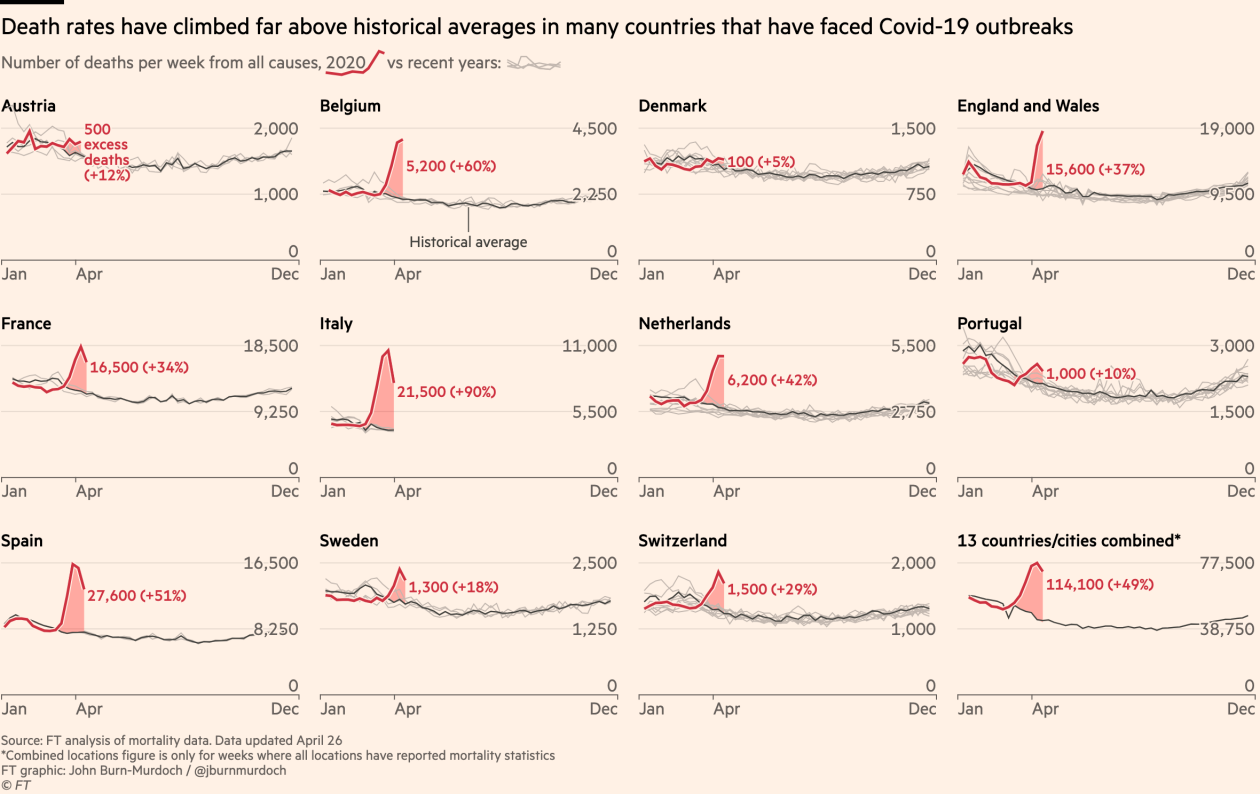 A Financial Times 14 ország hivatalos adatait vizsgálta úgy, hogy vette az idei április és március általános heti halálozási mutatóit, és összehasonlította a korábbi évek márciusi és áprilisi mutatóival. Természetesen az igazolt haláleseteket levonták az idei adatokból. Az eredmény: Dánia kivételével minden országban több mint gyanúsan magas eltéréseket találtak.