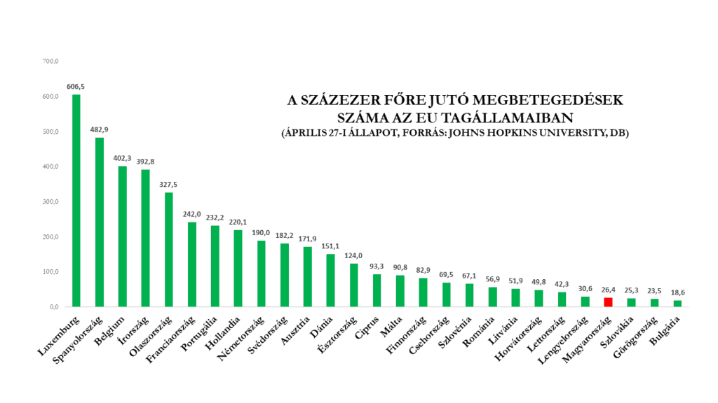 A lakosságszámhoz viszonyítva a legkevesebb fertőzött Bulgáriában és Görögországban van, de szintén rendkívül alacsony a fertőzöttségi szint Szlovákiában és Magyarországon is. Ezekben az országokban kevesebb, mint a lakosság 0,03 százaléka kapta el a koronavírust a regisztrált adatok alapján, ez százezer lakosra vetítve kevesebb, mint 30 fertőzött személyt jelent. Szintén jól vizsgázott a többi V4 ország, hiszen Lengyelország és Csehország is a jobban teljesítő országok között foglal helyet.