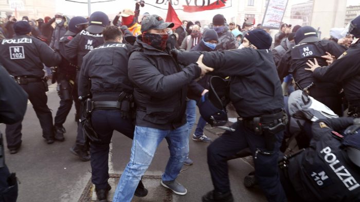 A bécsi Hősök terén összegyűlt tömeg „Szabadságot!” és „Ellenállás!” rigmusokat skandáltak, majd a tüntetők egy része összecsapott a helyszínre kivezényelt rohamrendőrökkel. A hatóságok paprikasprével válaszoltak, több embert letartóztattak.
