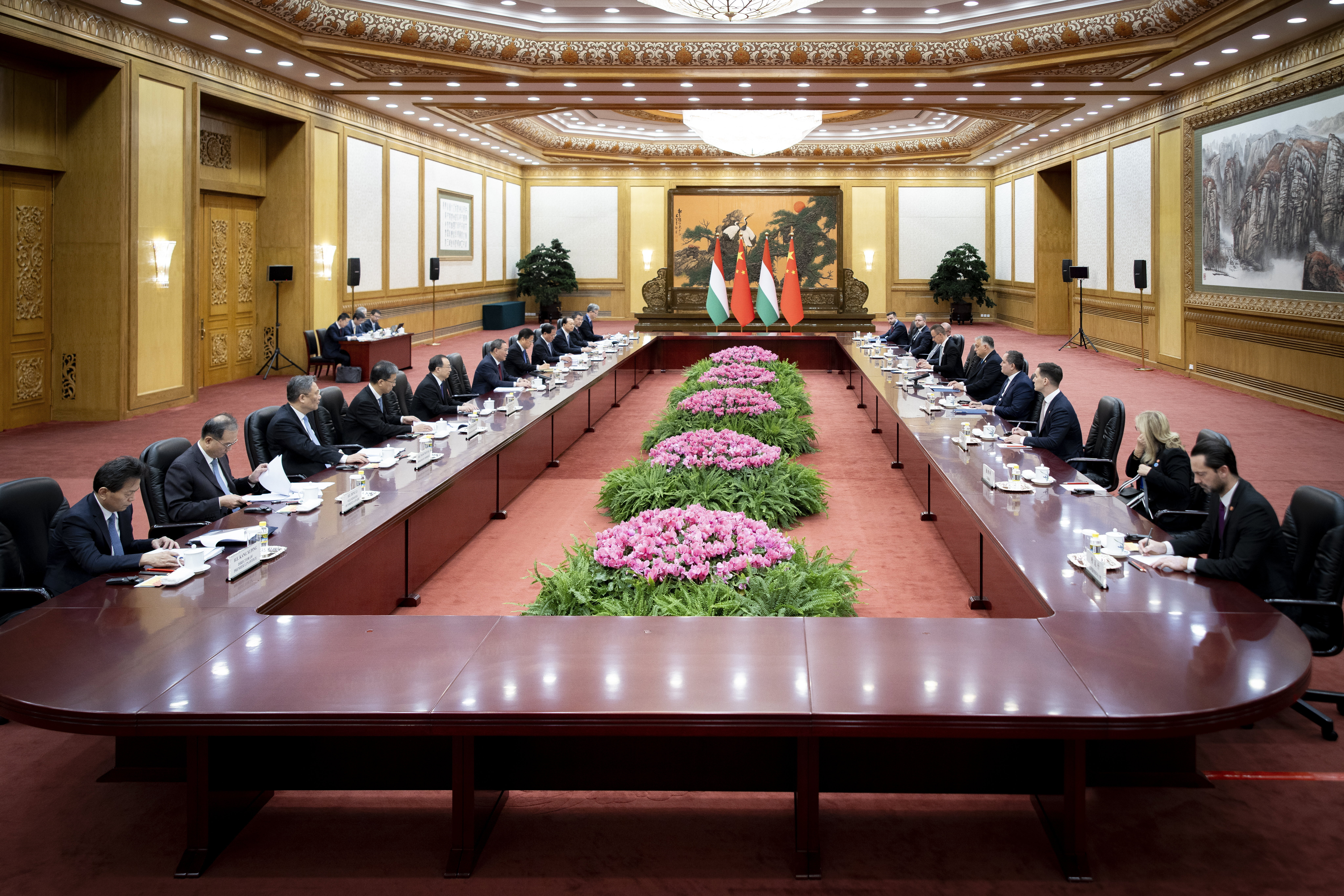 A Miniszterelnöki Sajtóiroda által közreadott képen Orbán Viktor miniszterelnök (j5) és Li Csiang kínai kormányfõ (b6) megbeszélést folytat Pekingben 2023. október 16-án. Orbán Viktor mellett Szijjártó Péter külgazdasági és külügyminiszter (j6) és Nagy Márton gazdaságfejlesztési miniszter (j4), jobbról Havasi Bertalan, a miniszterelnök sajtófõnöke (j1).