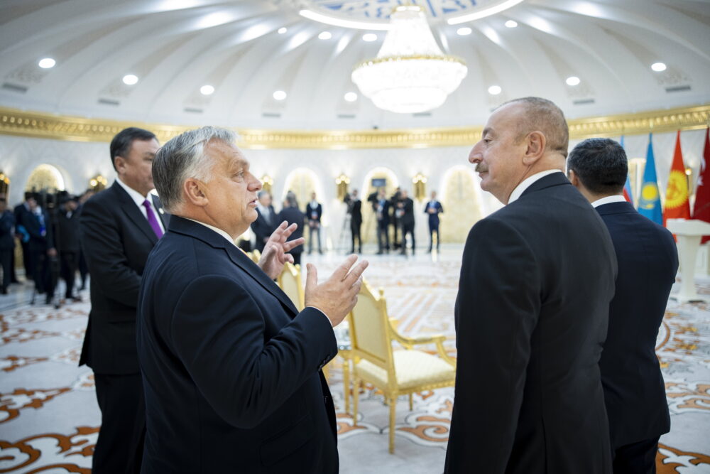 A Miniszterelnöki Sajtóiroda által közreadott képen Orbán Viktor miniszterelnök (b) és lham Alijev azeri elnök (j) a Türk Államok Szervezete 10. csúcstalálkozóján Asztanában 2023. november 3-án.