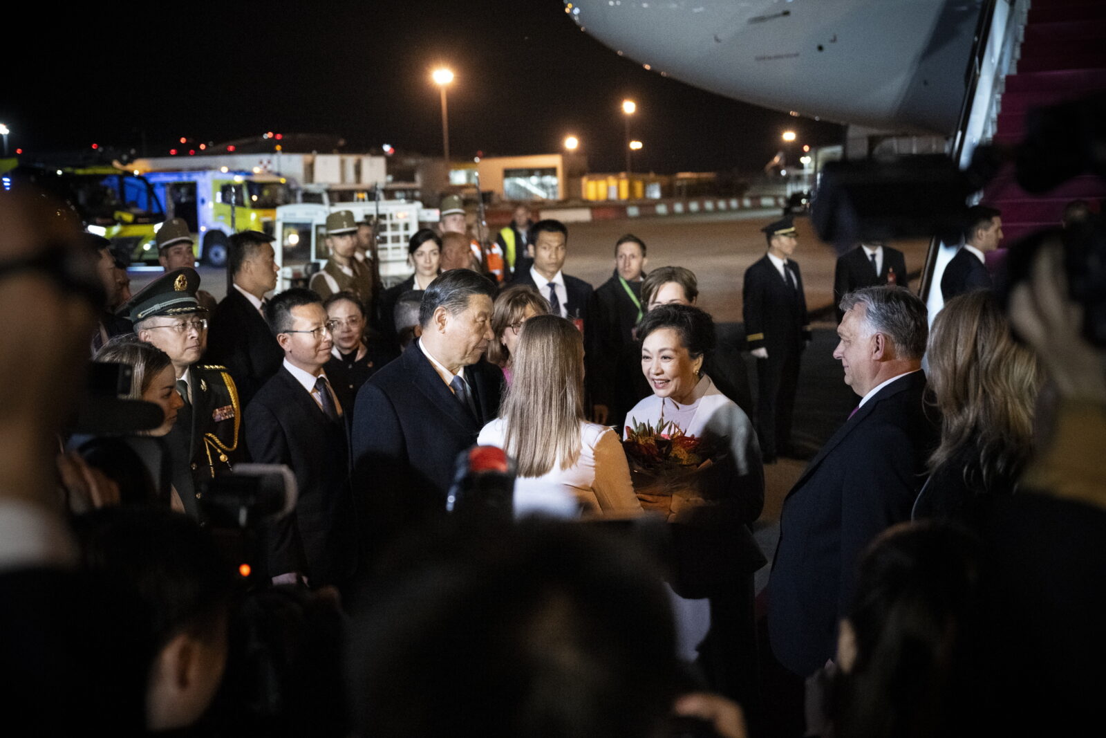 A Miniszterelnöki Sajtóiroda által közreadott képen Orbán Viktor miniszterelnök (középen jobbról) fogadja Hszi Csin-ping kínai elnököt (középen balról) a Budapest Liszt Ferenc Nemzetközi Repülõtéren 2024. május 8-án. Hszi Csin-ping mellett balról felesége, Peng Li-jüan.