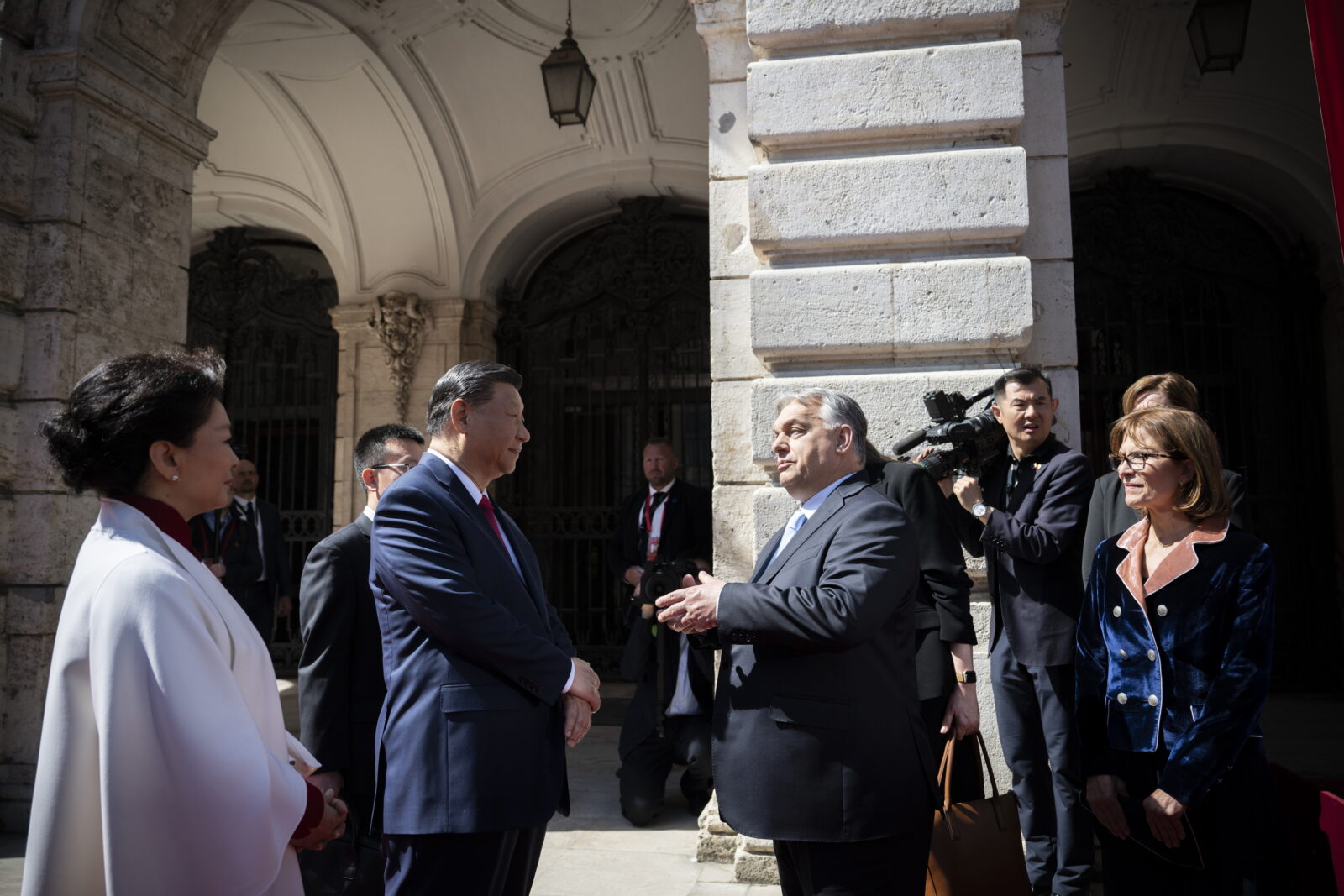 Sulyok Tamás köztársasági elnök katonai tiszteletadással fogadja Hszi Csin-ping kínai elnököt (középen, j-b) a Budavári Palota Oroszlános udvarában 2024. május 9-én. Mögöttük Orbán Viktor miniszterelnök, Peng Li-jüan, a kínai elnök felesége és Kun Szabó István, az államfõ fõhadsegédje (j-b).