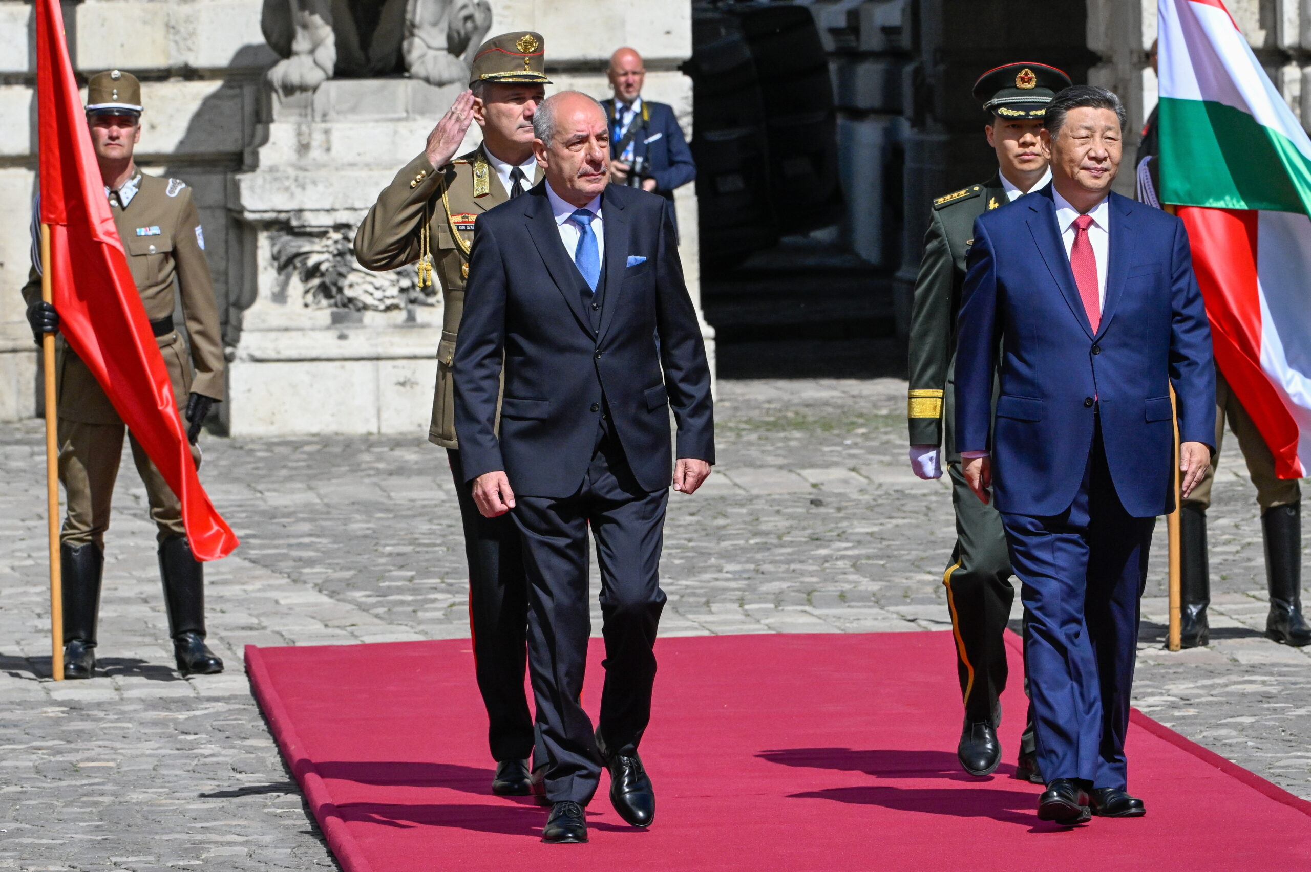 Sulyok Tamás köztársasági elnök katonai tiszteletadással fogadja Hszi Csin-ping kínai elnököt (j) a Budavári Palota Oroszlános udvarában 2024. május 9-én. Sulyok Tamás mögött fõhadsegédje, Kun Szabó István.