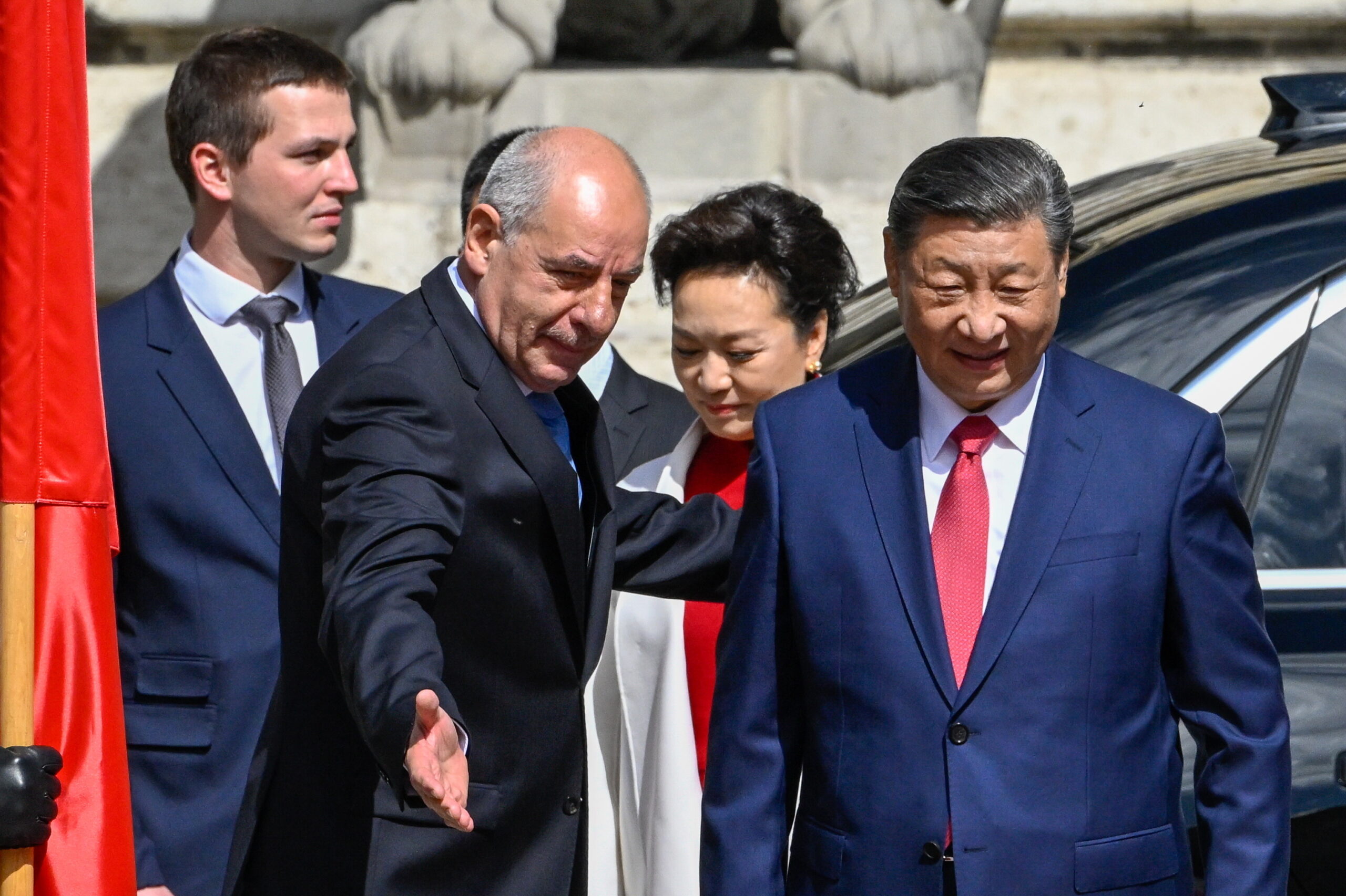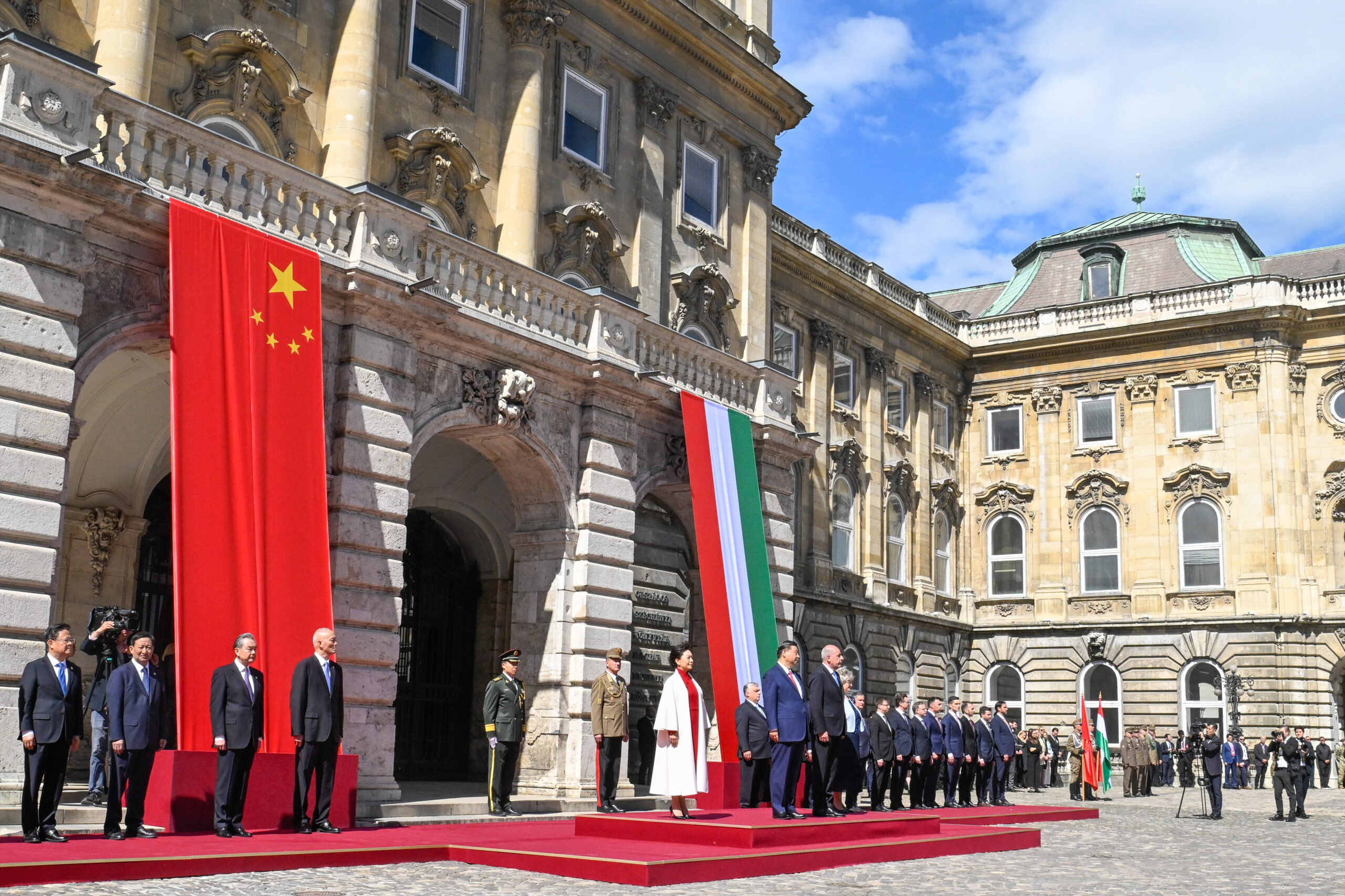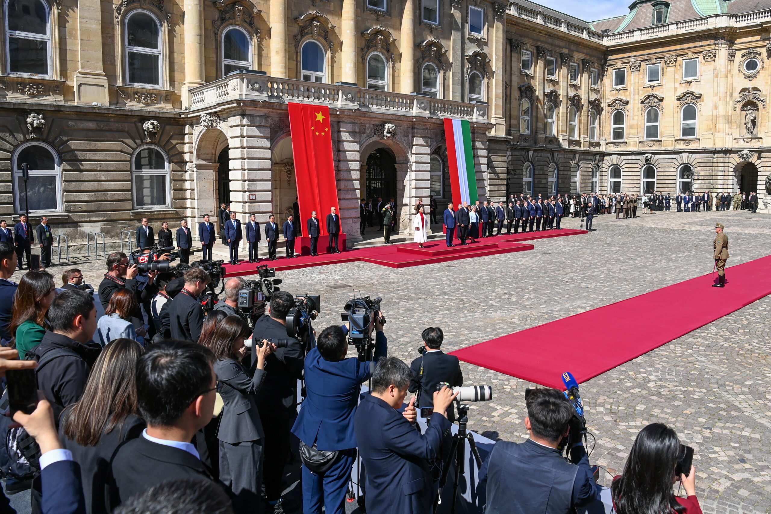 Sulyok Tamás köztársasági elnök katonai tiszteletadással fogadja Hszi Csin-ping kínai elnököt (középen, j-b) a Budavári Palota Oroszlános udvarában 2024. május 9-én. Mögöttük Orbán Viktor miniszterelnök, Peng Li-jüan, a kínai elnök felesége és Kun Szabó István, az államfõ fõhadsegédje (j-b).