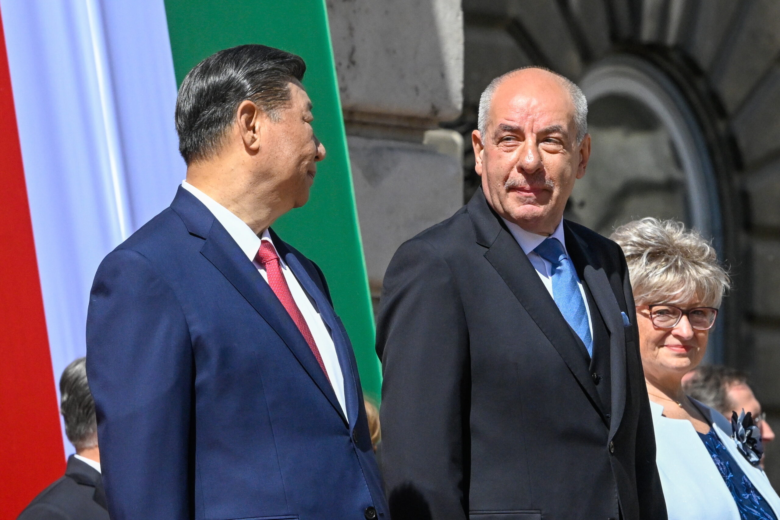 Sulyok Tamás köztársasági elnök (b2) katonai tiszteletadással fogadja Hszi Csin-ping kínai elnököt (b) a Budavári Palota Oroszlános udvarában 2024. május 9-én. Sulyok Tamás mögött felesége, Nagy Zsuzsanna.