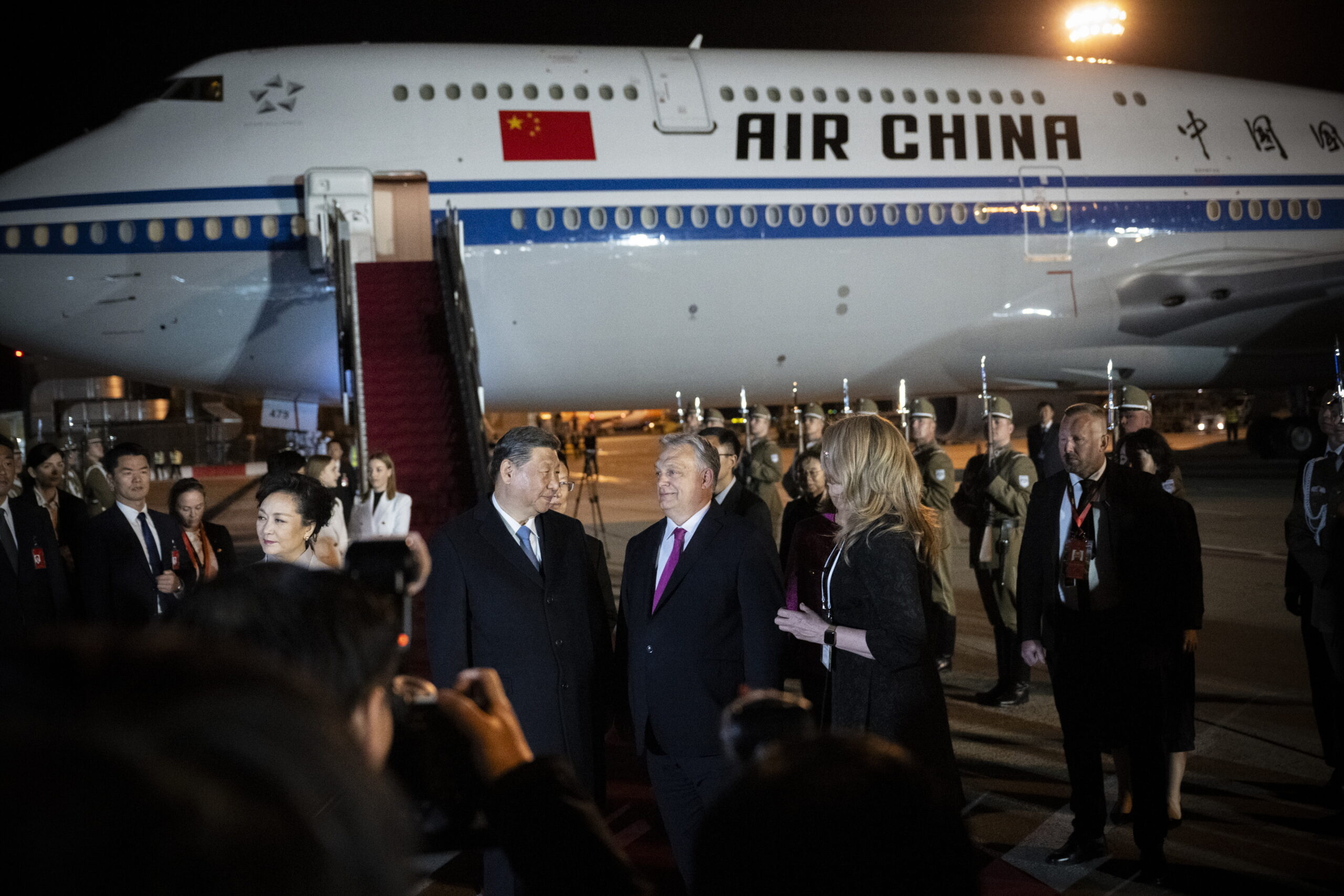 A Miniszterelnöki Sajtóiroda által közreadott képen Orbán Viktor miniszterelnök (középen jobbról) fogadja Hszi Csin-ping kínai elnököt (középen balról) a Budapest Liszt Ferenc Nemzetközi Repülõtéren 2024. május 8-án. Hszi Csin-ping mellett balról felesége, Peng Li-jüan.