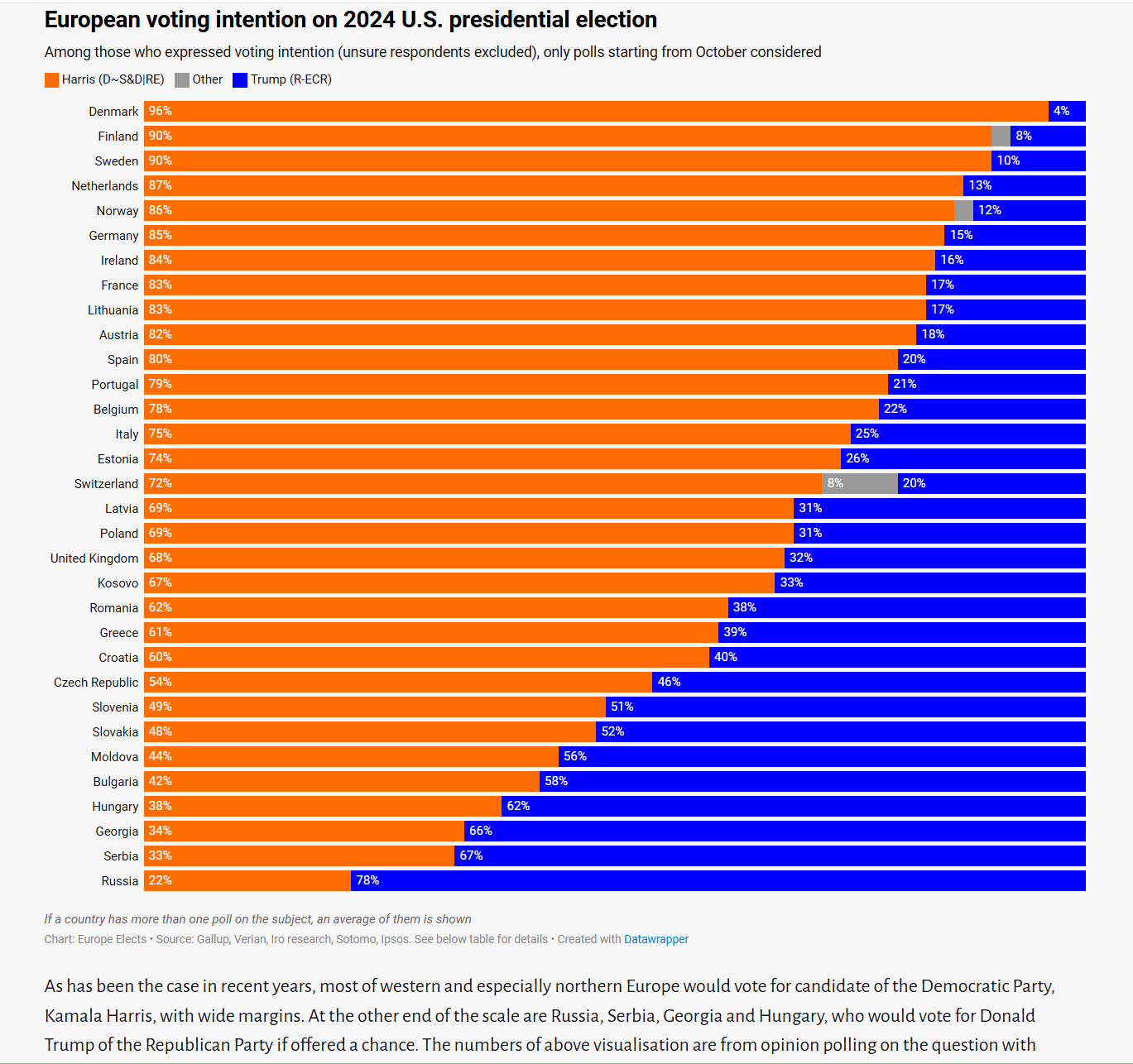 A Gallup ügynökség rendkívül érdekes felmérést tett közzé arról, kire szavaznának az amerikai elnökjelöltek közül az európaiak – ha tehetnék. A eloszlás elég nyilvánvaló, maroknyi olyan uniós tagállam van, ahol Trump nyerne. Ehhez persze nagyban hozzájárul az a boszorkányüldözéssel felérő progresszív propaganda, amit a nyugati mainstream sajtó produkál.
