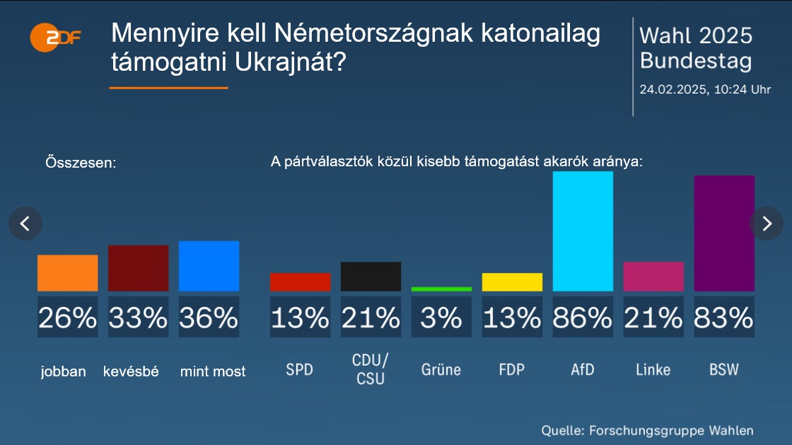 A választók negyede fokozná Ukrajna támogatását, harmada csökkentené. Ez különösen fontossá válhatna, ha az EU szembefordulna az épp kibontakozó amerikai koncepcióval és fokozná Ukrajna katonai támogatását. Ennek valószínűsége nem túl nagy, főképp nem a 80 éves német lakájpolitika tükrében