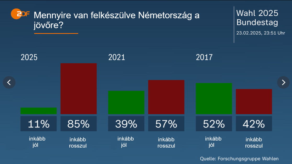 A fenti ábra, ami a választási eredményeket volna hivatott bemutatni, épp ezt a folyamatot szemlélteti: látjuk, hogy sokasodásuk koalícióba kényszeríti az egalizálódó pártokat, ami irányíthatatlanná teszi az országot. Az előző ciklusban leszerepelt AMPEL-(zöld-sárga-piros)-koalíció iskolapéldája volt ennek a politikai tehetetlenségnek. A németek régóta látják a bajt. Hogy felkészültek volna a jövőre, csak 11% hiszi. Hogy nem, azt 85%!