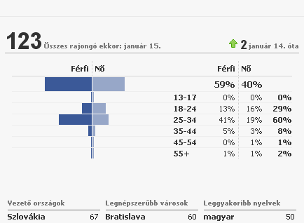 2010. jan. 17. 22:20a FB is tanulhatna a googletol, aztan irhatna, hogy Pozsony. gondolom kerekitenek a szamoknal, de elsore rogton foltunt, hogy 59% ferfi, 40% no, 1% akkor micsoda? :D