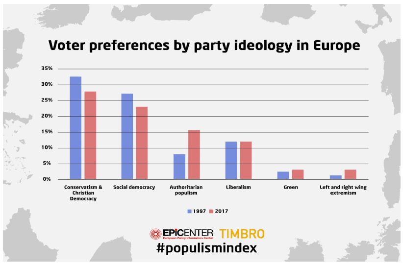 Egy Politico brüsszeli hírportál által idézett felmérés szerint az európai kontinensen 55,8 millió ember az országa legutóbbi parlamenti választásain önkényuralmi retorikájú pártra szavazott, ami egyébként az összlakosság cca. 10 százaléka. Ezzel a szélsőséges pártok 1342 helyet szereztek az uniós nemzeti parlamentekben (az összes székek száma 7843, vagyis a szélsőséges képviselők száma 17,11 százalékot tesz ki).