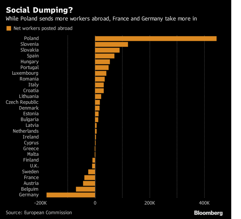 Szlovákia a harmadik legtöbb kiküldött munkást foglalkoztatja valamelyik másik uniós tagállamban Lengyelország és Szlovénia után – közölte a Bloomberg gazdasági portál. Az adott időszakra külföldön alkalmazott kelet-európai munkaerők tömegét Emmanuel Macron „szociális dömpingnek” nevezi, akik „hazai” munkásoktól veszik el a munkát. Ennek orvoslására a francia elnök úgy véli, növelni kell a bérkülönbségeket, ezért találkozott Salzburgban a Slavkovi Hármakkal, illetve Romániával és Bulgáriával.