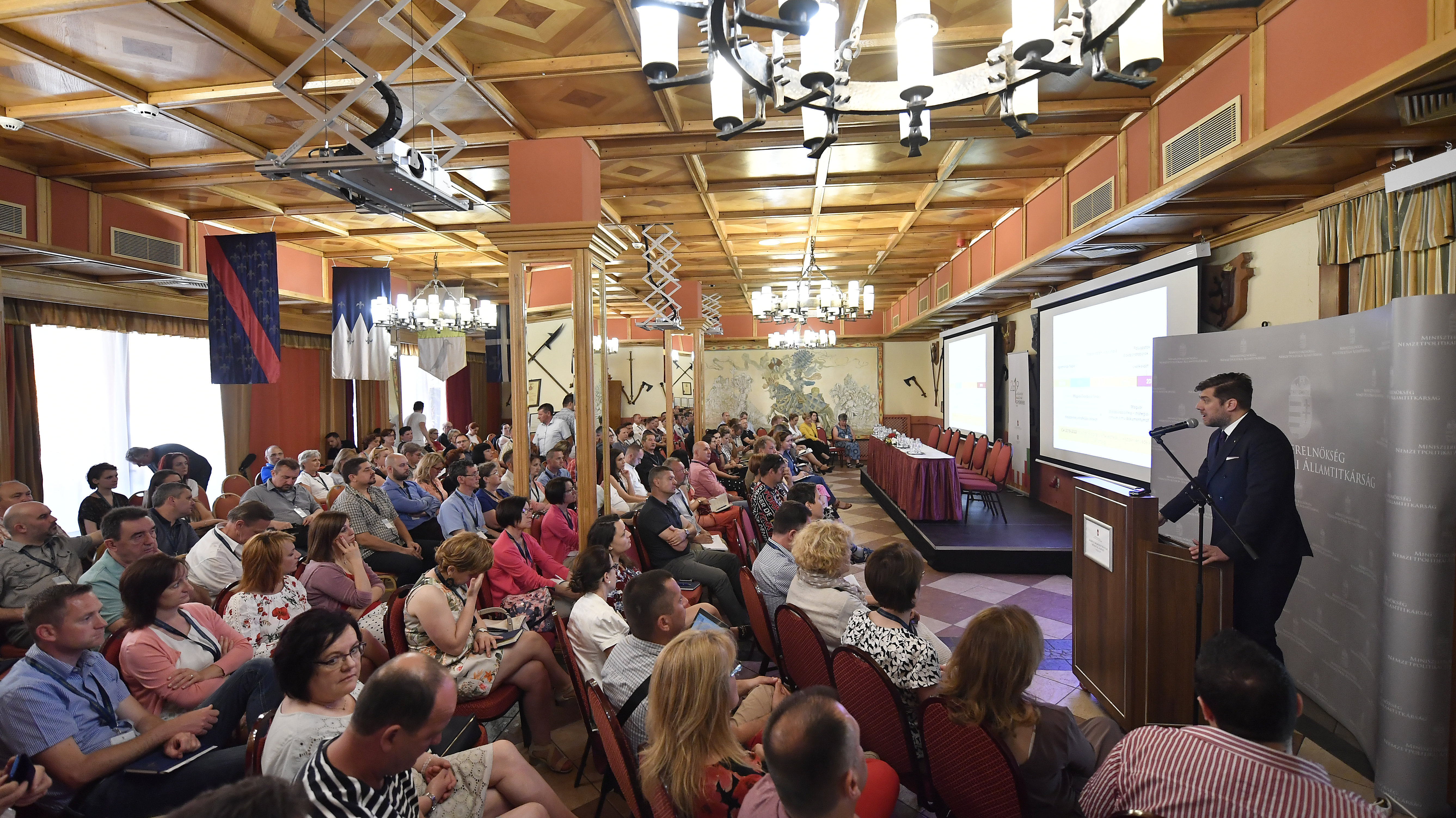 Szilágyi Péter nemzetpolitikáért felelõs miniszteri biztos beszédet mond az I. Kárpát-medencei Magyar Médiatalálkozón a visegrádi Hotel Silvanusban 2019. június 13-án.