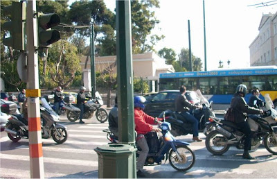 A belvárosi dugókat úgy próbálják enyhíteni, hogy az egyik nap csak páros számmal végződő autók mehetnek a belvárosba, míg a rákövetkező nap páratlan számmal végződőek. Ami ugyan nem sokat segít, lévén hogy aki megteheti, annak két autója van, és cserélgeti őket. Ez a legelején engemet is egy cseppet összezavart, mert a haver az első nap egy Opellal jött értem, a második nap egy Renóval, aztán már viccelődtem, és rákérdeztem, hogy akkor holnap milyen autóra számítsak. Úgy lehet megkülönböztetni az athéni autót a vidékitől, hogy az athénin legalább egy karcolás, vagy horpadás van, amelyiken nincs, az nem is városi kocsi, vagy még frissen vásárolt. A 2004-es olimpia sokat segített a város infrastruktúráján, új metróvonal lett kiépítve, új reptér, új autósztráda keresztül a városon. De a kesődélutáni dugók így is hatalmasak. Egyik pénteki nap gyalogosan mentem haza durva 5-6 km-t, közben meg minimum 10 buszt előztem le, amelyek jók lettek volna nekem.