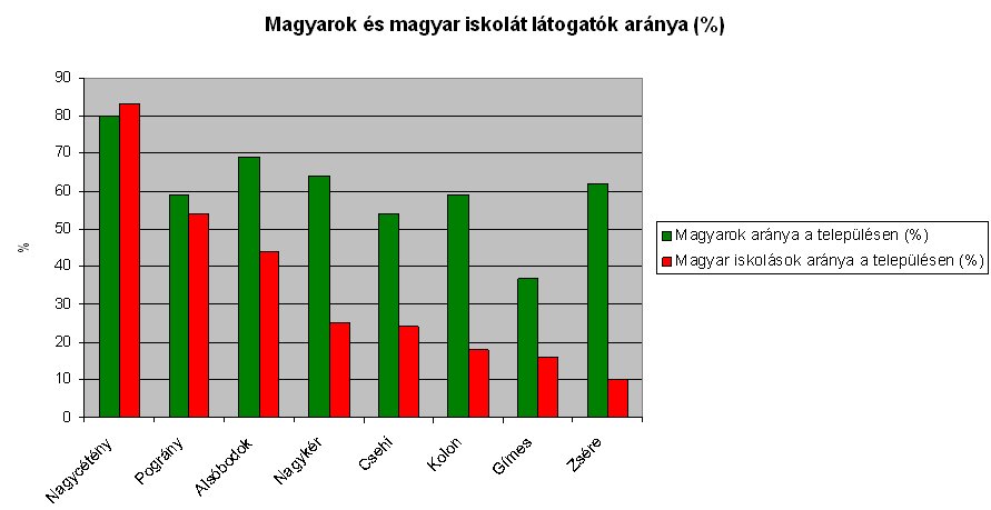 Később tapasztaltuk, sokszor sajnos a magyar iskola léte sem garancia erre az utánpótlásra, amit a következő grafikonon láthatunk. Az egyik oszlopban a faluban élő magyarok arányát, míg a másikban a falu alapiskoláit látogató gyerekek közül a magyar iskolát választók arányát látjuk. Egyedül Nagycétényben és Pogrányban jár a gyerekek több, mint fele magyar iskolába, közelíti az 50%-t még Alsóbodok is. Szerintem a koloni és gímesi alapiskolák részben elszívhatják egymástól a diákokat, de elnézve pl. a gímesi iskola weboldalán a szlovák osztályok gyerekeinek neveit, megélhetnének egymagyukban is, ha a magyar gyerek, magyar iskolába kerülne… Kalandos a helyzet Nagykéren is, ahol a falu kétharmada magyar, magyar iskolába a gyerekek 25%-a jár és ez a bejáró berencsi magyar diákokkal együttes adat (ha vannak még egyáltalán).