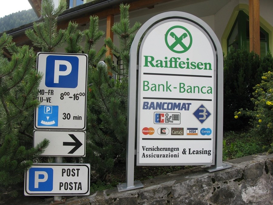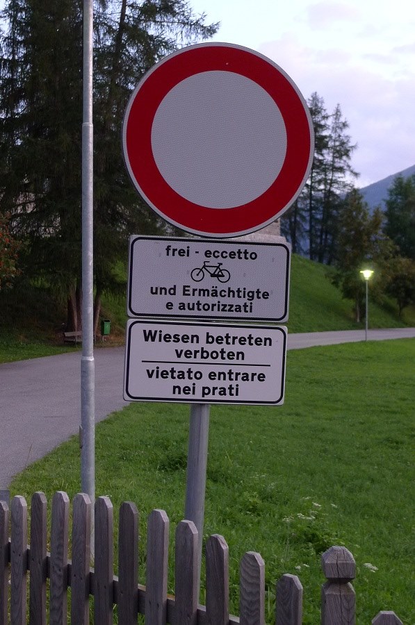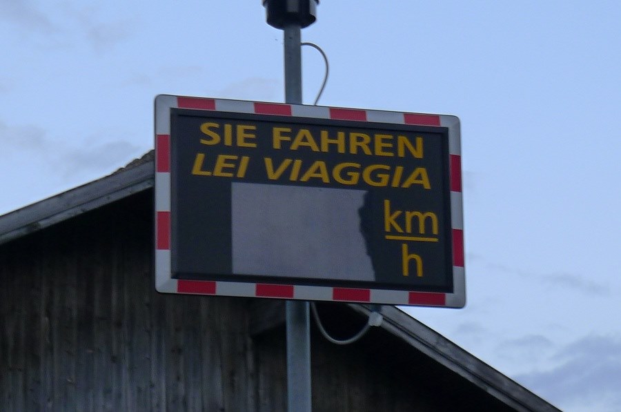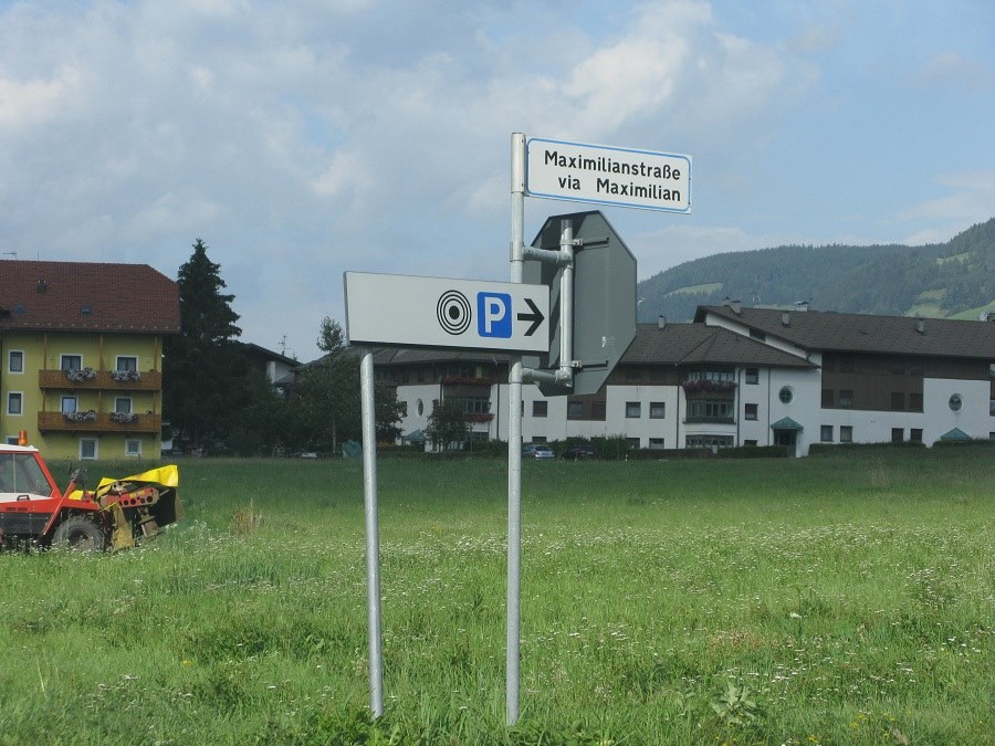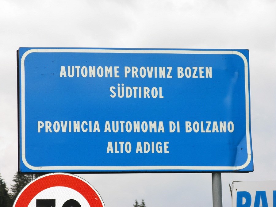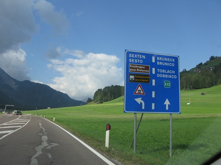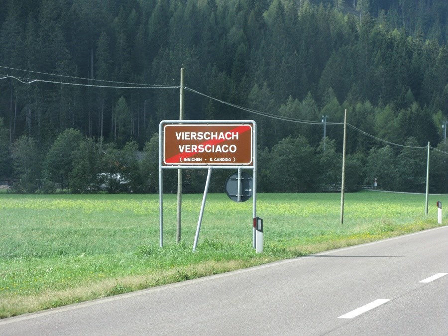 Községnévtábla. Az olasz és a német felirat ugyanolyan méretű, ráadásul mindez előbb a kisebbség nyelvén. Szlovákiában ilyesmi elképzelhetetlen.