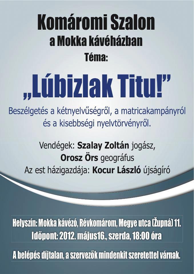 Egy kisebb komáromi kiruccanás kereteiben a Körkép részt vett a komáromi szalon Lúbizlak Titu! című  beszélgetőestjén. A fő témák a kedélyeket borzolgató kétnyelvűség és a matricázók, illetve a jogaink voltak, amikkel (nem) élhetünk itthon, Szlovákiában. Kocur László, blogger, az Új Szó online szerkesztője beszélgetett mindezekről Orosz Örs geográfussal, a Nyelvében él a národnostná mešina kiállítás kurátorával és Szalay Zoltán jogásszal, aki a kisebbségi nyelvtörvény előkészítésében vett részt.