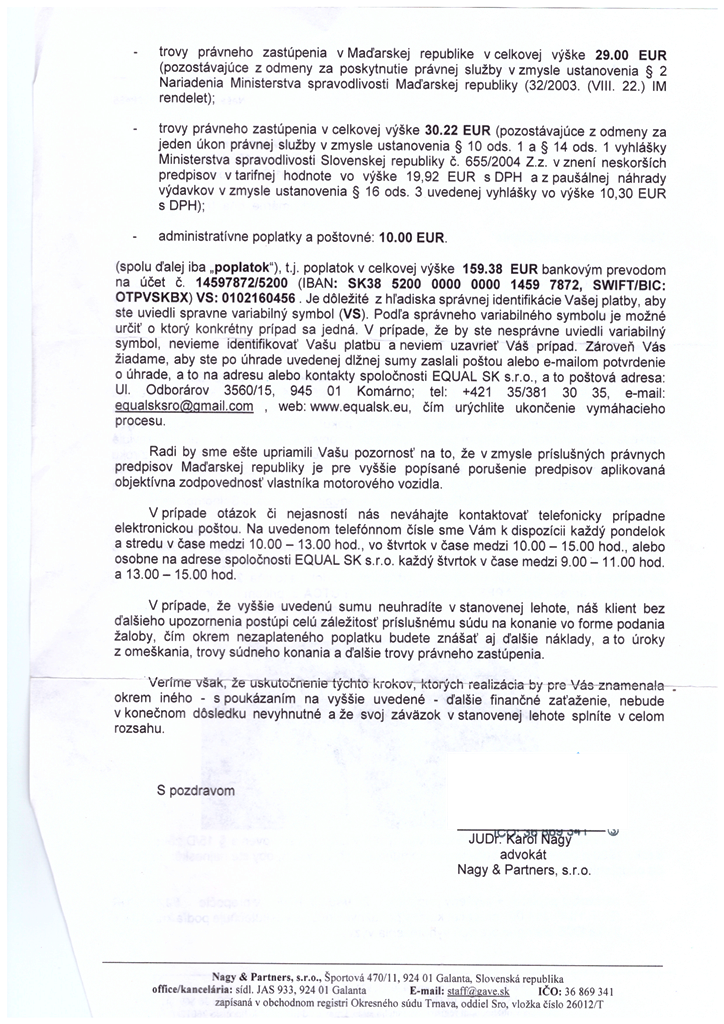 Karol Nagy galántai ügyvéd sorra küldi ki a fizetési felszólításokat, mégpedig egy köztes elem beiktatásával. Az ügyvéd nem közvetlenül a parkolócégek megbízásából postáz, hanem egy EQUAL SK s.r.o. nevű, Komáromban bejegyzett cég meghatalmazása alapján. A jelenlegi“képlet”: hat budapesti kerületi önkormányzati cég és egy esztergomi parkolócég megbízta a parkolási bírságok szlovákiai behajtásával az említett EQUAL SK s.r.o.-t. Ők meghatalmazás útján “továbbadták” a pénzbehajtással kapcsolatos feladatokat a galántai ügyvédnek. A megbízások, meghatalmazások egyébként megtalálhatók az EQUAL SK honlapján.