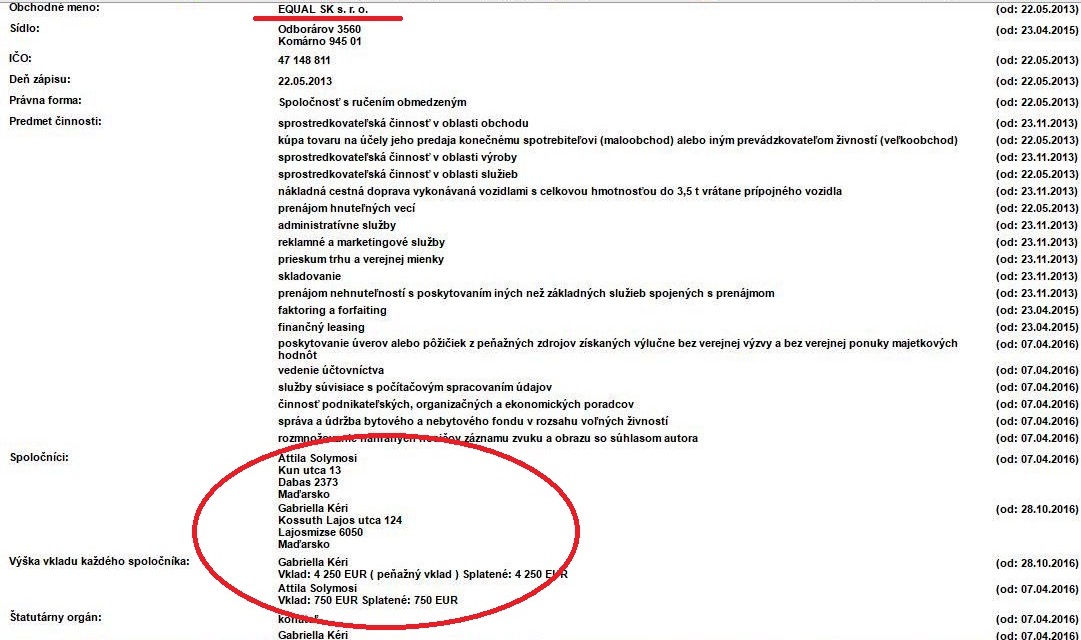 Az EQUAL SK s.r.o. ügyvezető-tulajdonosa és annak tulajdonostársa a szlovákiai cégnyilvántartás szerint mindketten magyarországi lakhelyű magyar állampolgárok, név szerint Solymosi Attila dabasi és Kéri Gabriella lajosmizsei lakosok.