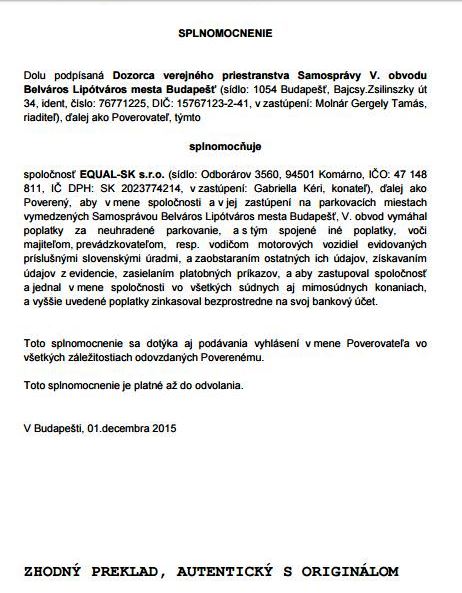 Mindenesetre az EQUAL SK s.r.o. honlapján egy olyan meghatalmazás szkennelt másolata olvasható, amely alapján a Belváros–Lipótváros Közterület-felügyelet az EQUAL SK s.r.o.-t hatalmazza meg a parkolási díjak szlovákiai behajtásával.