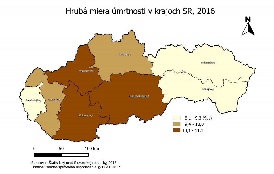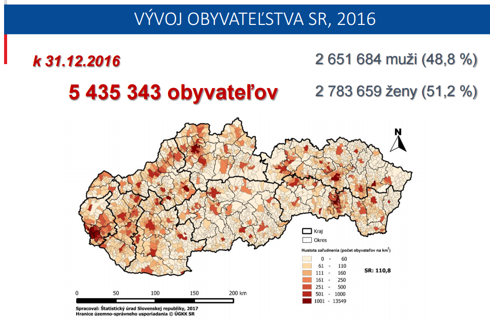 Szlovákia népsűrűsége és népessége 2016-ban. Forrás: Statistics.sk