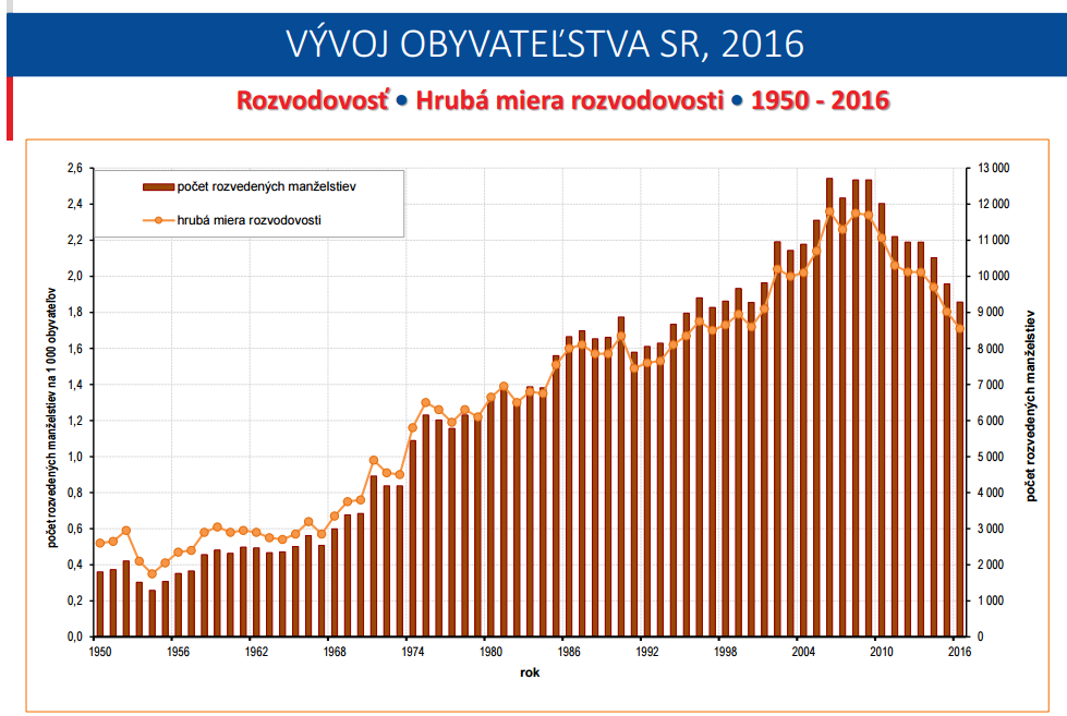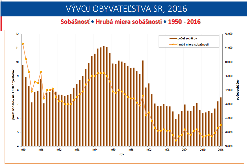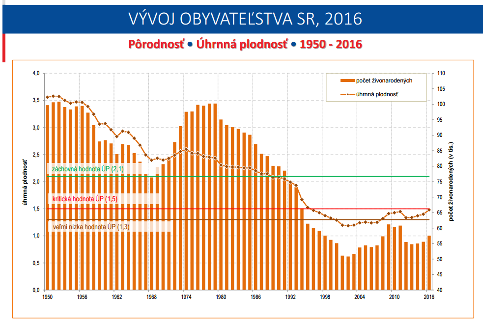 Az alábbi grafikon mutatja meg a szlovákiai demográfia Achilles-sarkát. Az oszlopok az élveszületések számát mutatják ezer főben, a pontozott vonal pedig a termékenységet. A népesség szinten tartásához egy családban átlagban 2,1 gyermekre van szükség (2 gyerek a két szülő pótlására, plusz 0,1 a gyermekhalandóság ellensúlyozására, tehát egyes családokban kettőnél több gyermeknek kellene születnie), ez az egyensúlyi termékenységi ráta, amit a grafikonunk egy zöld vonallal jelöl.
