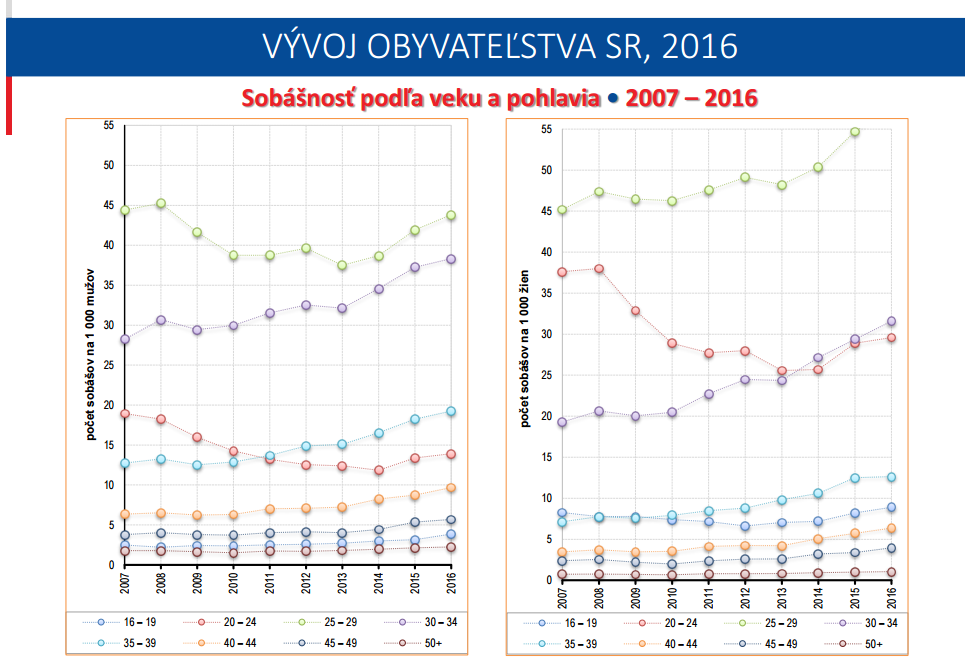 Az elsőre kicsit bonyolultnak tűnő grafikonok 2007 és 2016 házasságkötési adatait hasonlítják össze. Többek között rámutatnak arra, hogy nagymértékben zuhant a 20-24 éves korban házasodók száma, a legtöbben már 25-29 éves korban nősülnek meg, vagy mennek férjhez, de meredeken emelkedik a 30-34 évesek házasságkötéseinek száma.